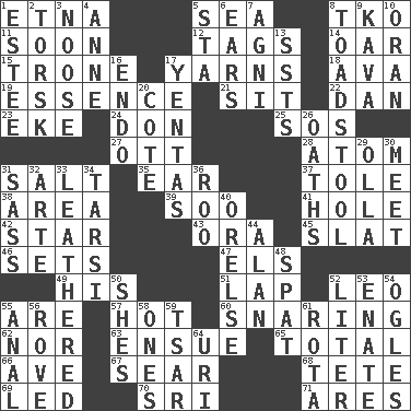 ACROSS 1. Inactive volcano in Sicily 5. Ocean 8. Ring climax 11. Within a short period 12. Labels 14. Boat paddle 15. Heavy duty weighing machine 17. Entertaining tales 18. Actress Gardner 19. Core 21. Be seated 22. Daniel's nick name 23. Make supply last 24. Spanish title 25. Mayday 27. Baseball player Mel 28. Tiny particle 31. Table seasoning 35. Hearing organ 37. Lacquered or enameled metalware 38. Length times width 39. "Barney Miller" actor Jack 41. Hollow 42. Play the lead 43. Mouth or opening 45. Narrow board 46. Puts into a specified state 47. Raised railways 49. Part of HMS, perhaps 51. Infant locale 52. Lion 55. "We ___ not amused" (Victoria) 57. Being at a high temperature 60. Catching in a trap 62. And not 63. Follow as a consequence or result 65. "_____ Recall" 66. "___ Maria" 67. Wither 68. False hair 69. Directed 70. Indian title of respect (Mr.) 71. Ancient Greek god of war DOWN 1. First name in cosmetics 2. Cod relative 3. Trap for birds or small mammals 4. Singer Murray 5. R.R. building 6. Hearing organs 7. Hindu god of fire 8. Inedible or poisonous agaric 9. Polynesian shrub of the pepper family 10. NW Algerian seaport 13. Fast planes 16. Inside; within (prefix) 17. Gossips 20. ____ d'Azur (French Riviera) 26. Curses 29. Water jar 30. Confront 31. Backtalk 32. Johnson of "Laugh-In" 33. Tough but pliablecoriaceous 34. Tarsus (plural) 36. Friend of Pooh 40. Threatening words 44. Actor Alda or Thicke 48. Argument over a trivial matter 50. "______ My Girl" (Turtles hit) 52. 61 cubic inches 53. Maternal 54. Stares 55. Of or related to the anus 56. Be footloose 58. Singles 59. Russian ruler of old 61. Roll call or roster of names 64. RI univ.