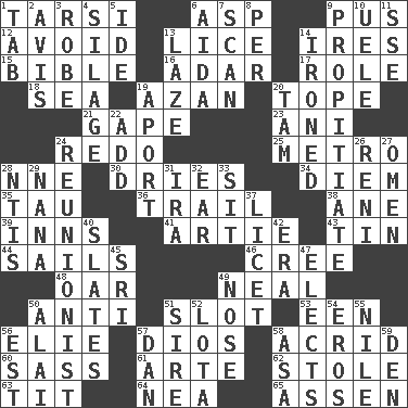 ACROSS 1. Tarsus (plural) 6. Cleo's killer 9. Fluid product of inflammation 12. Prevent from happening 13. Louse (plural) 14. Angers 15. God's Word 16. The sixth month of the Jewish calendar 17. Hero or heavy, e.g. 18. Ocean 19. Muslim summons to prayer 20. Drink excessively 21. Open wide 23. Cuckoo 24. Redecorate 25. Paris' subway 28. Compass dir. 30. Frees from moisture 34. South Vietnam president (1954) 35. The 19th letter of the Greek alphabet 36. Hang back 38. A saturated hydrocarbon 39. Lodging establishments 41. Nick name for Arthur 43. Metal container 44. Moves on water 46. Algonquian 48. Rowing implement 49. Anneal 50. Against 51. Narrow opening 53. Car or cant ending 56. Writer Wiesel 57. "Vaya con ____" 58. Bitter 60. Backtalk 61. Johnson of "Laugh-In" 62. Took without asking 63. Teat (slang) 64. Teachers' org. 65. NE Netherlands city DOWN 1. Keyboard key 2. Opinion 3. Loose flowing garment 4. Fodder prepared in a silo 5. Binary compound 6. Opera by Verdi 7. Examine hastily 8. For each 9. Conciliate 10. Ubangi River tributary 11. Compass dir. 13. Goldbrick 14. Pressed 19. To the left, to Queeg 20. Scottish cap 22. Find the sum of 24. One who advocates reunion 26. Painter Guido (1575-1642) 27. Sign of something about to happen 28. Nuclear Threat Initiatives 29. Grandmother 31. Lyricist Gershwin 32. Hearing organ 33. Be seated 37. It is permitted: Lat. 40. Chalkboards 42. Period 45. _ Lanka 47. Opts 49. Characteristic smell of wine 50. Jai _ 51. Beget 52. Globular water bottle used in Asia 54. Greek god of love 55. "Death on the ____" 56. Eastern Standard Time (abbr.) 57. One of the 12 tribes of Israel 58. White ___ sheet 59. Lair