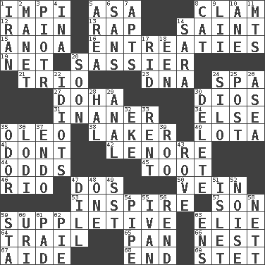 ACROSS 1. Body of Kaffir warriors 5. White ___ sheet 8. Burrowing marine mollusk 12. Precipitation 13. Reproach for some lapse or misdeed 14. Virtuous person 15. Small Philippine buffalo 16. Pleas 19. Fish or hair follower 20. More impudent 21. Musical group of three 23. Heredity factor (abbr.) 24. Health resort 27. Capital of the state of Qatar 30. "Vaya con ____" 31. Sillier 34. Otherwise 35. Margarine 38. Member of a famous L.A. basketball team 40. Globular water bottle used in Asia 41. Do not 42. Poe poem 44. Probability 45. A blast of a horn 46. _ de Janeiro 47. Two (Sp.) 50. Distinctive style or manner 53. Motivate 57. Male offspring 59. Supplementary 63. Writer Wiesel 64. Hang back 65. Baking dish 66. Egg locale 67. Assistant 68. Conclusion 69. Proofreading order DOWN 1. SW Asia republic 2. French painter Edouard 3. Peter (Polish) 4. _ tizzy (2 wds.) 5. Type of rug 6. Without 7. Flats, for short 8. Domesticated feline 9. Cards in a Roman deck? 10. A saturated hydrocarbon 11. Mountains (abbr.) 14. "Two Mules for Sister ____" 17. To free from 18. Car or cant ending 20. Within a short period 22. Foolish or stupid persons 24. Grain storage tower 25. Mail 26. Toward the sea 28. Actor Linden 29. Of or related to the anus 30. Erase 32. Supplement with great effort 33. Monthly bill 35. Scent 36. Farming town in central California 37. Inside; within (prefix) 39. Friend of Pooh 43. Be footloose 47. Deli pickle 48. Single 49. Fast jet (abbr.) 51. Small island 52. Annoying sound 54. Corncob 55. "Terrible" tsar 56. Tear apart 58. Remaining after all deductions 59. R.R. building 60. RI univ. 61. Writing tablet 62. Sliced dessert 63. Followers of ems