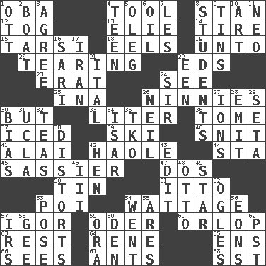 ACROSS 1. Chief or king in Benin or Nigeria 4. Implement 8. Comedian Laurel of Laurel & Hardy 12. Coat; cloak 13. Writer Wiesel 14. Become fatigued 15. Tarsus (plural) 18. Snakelike fish 19. To (old English) 20. Rending 22. Begley and Asner 23. Part of Q.E.F. 24. Perceive with the eye 25. _ tizzy (2 wds.) 26. Simpletons 30. On the contrary 33. 61 cubic inches 36. Heavy book 37. On the rocks 39. What Jean-Claude Killy likes to do 40. In a ____ (agitated or irritated) 41. Jai _ 42. White Person, in Hawaii 44. R.R. building 45. More disrespectful 47. Two (Sp.) 50. Shallow baking pan 51. "Tell ____ the Marines!" 53. Luau course 54. Electrical Measurement 57. Composer Stravinsky 59. Baltic tributary 61. Lowest deck of a ship 63. Remainder 64. French philosopher Descartes 65. Followers of ems 66. Perceives with the eye 67. Pismires 68. Fast jet (abbr.) DOWN 1. Baseball player Mel 2. Water vessel 3. Match 4. Adolescent 5. Cassini of fashion 6. Lubricate 7. French article 8. SAT takers 9. Airtight sealed metal containers 10. Nonscientific branch of learning 11. Modern: prefix 16. Indian skirt 17. SW Asia republic 21. Slanted text style (abbr.) 22. Car or cant ending 24. Title for a knight 26. Famous astronaut Armstrong 27. Charged atoms 28. Send forth 29. Stalk of a moss capsule 30. Prejudice 31. Southern CA. univ. 32. Beverages made from leaves 34. Austrian river, tributary to the Danube 35. Ring climax 38. What propaganda does 42. Layer 43. Prepare for publication 46. One more than two 48. Von Bismarck 49. Play the lead 52. Stares 53. Introduce or present, as a question 54. Gone 55. Ancient Greek god of war 56. Immeasurably long periods of time 57. Big collection agency 58. Turn to the right 59. Mouth or opening 60. Lair 62. Pacific Standard Time (abbr.)