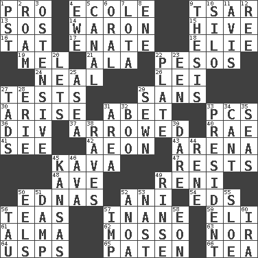 ACROSS 1. Adept person 4. Learning spot: Fr. 9. Russian ruler of old 13. Mayday 14. Make _____ (do battle with) 15. Hub of activity 16. Make lace 17. Maternal 18. Writer Wiesel 19. Cartoonist voice _ Blanc 21. According to 22. Mexican monetary units 24. Anneal 26. Luau accessory 27. Trials 29. Without 30. Ascend 31. Collude with 33. Personal Computers (abbr.) 36. HTML Container Element 37. Moved like an arrow 40. Actress Charlotte 41. Perceive with the eye 42. Period of immesurable duration 43. Sports stadium 45. Polynesian shrub of the pepper family 47. Musical pauses 48. "___ Maria" 49. Painter Guido (1575-1642) 50. Ferber et al. 52. Cuckoo 54. Begley and Asner 56. Afternoon social gatherings 57. Silly 59. Biblical high priest 61. _ mater 62. With motion or animation 63. Not either 64. United States Postal Service (abbr.) 65. Eucharist need 66. Beverage made from leaves DOWN 1. Pacific Standard Time (abbr.) 2. Wander aimlessly 3. Clearly or manifestly demonstrative 4. She-sheep 5. Lessep's creation 6. Relating to the mouth 7. Globular water bottle used in Asia 8. Compass dir. 9. College paper 10. Grain storage tower 11. Deliberation 12. To separate or throw off 20. Allows 22. Food holder 23. Car or cant ending 25. At sea 27. Small boys 28. One of the Great Lakes 29. Stitched 31. Type of rug 32. Oct. 31 cry 33. Elected leader of a country 34. Patter 35. Oceans 38. All-night dance parties 39. Have the gumption 44. French philosopher Descartes 45. Sunflower state 46. Actress Gardner 49. Wash lightly 50. Snakelike fish 51. Moist 52. Small Philippine buffalo 53. Political cartoonist Thomas 55. A type of plum 56. The 19th letter of the Greek alphabet 57. Naughty child 58. Age 60. Lyricist Gershwin