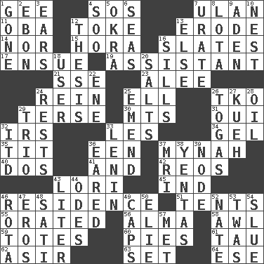 ACROSS 1. Turn to the right 4. Distress signal 7. ____ Bator, Mongolia 11. Chief or king in Benin or Nigeria 12. Puff or smoke 13. Eat (away) 14. Or not 15. Israeli folk dance 16. Chalkboards 17. Take place subsequently 19. Aide 21. Compass dir. 23. Toward shelter 24. It's straight from the horse's mouth 25. Pipe bend 26. Ring climax 29. Laconic 30. Mountains (abbr.) 31. Fr. "Yes" 32. Big collection agency 33. French article 34. Set 35. Teat (slang) 36. Car or cant ending 37. Non-adult bird? 40. Two (Sp.) 41. Plus 42. Vintage cars 43. Australian parrot (variant) 45. Working for oneself (abbr.) 46. Dwelling 51. Portable shelters 55. Spoke pompously 56. _ mater 58. Leather borer 59. Hauls 60. Sliced desserts 61. The 19th letter of the Greek alphabet 62. SW Saudi Arabia district 63. Put into a specified state 64. Compass dir. DOWN 1. Went 2. Inky black, to poets 3. Hearing organs 4. "Barney Miller" actor Jack 5. Gumbo ingredient 6. Oceans 7. A salt of uric acid 8. Globular water bottle used in Asia 9. Arabian gulf 10. A home for chicks 12. College paper 13. Otherwise 16. Beverly of Met fame 18. One who uses or employs something 20. Table seasonings 22. Compass dir. 24. Musical pauses 25. Make improvements or corrections to 26. Ancient Roman robes 27. Malaysian steamed pastry 28. Lubricate 29. Musical group of three 32. It would 33. Soviet premier 1918-24 36. Having ears or earlike features 37. Medical imaging device (abbr.) 38. Gossips 39. Thickened enlargement 43. 61 cubic inches 44. Lyric poems 46. Round or rotation of duties 47. Greek god of love 48. Suttee (variant) 49. Balmoral and tarboosh 50. Writer Wiesel 52. Nathan's nickname 53. It was, poetically 54. Change direction abruptly 57. Was introduced to