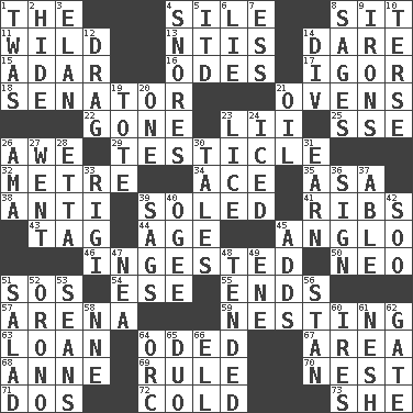 ACROSS 1. Definite Article 4. Drop; flow; fall 8. Be seated 11. Rampant 13. Nuclear Threat Initiatives 14. Have the gumption 15. The sixth month of the Jewish calendar 16. Lyric poems 17. Composer Stravinsky 18. Elected representative 21. Baking chambers 22. Went 23. Cards in a Roman deck? 25. Compass dir. 26. Deep reverence 29. A testis 32. Distance measurement (Brit.) 34. Adept person 35. White ___ sheet 38. Against 39. Having a sole or soles 41. Teases 43. Label 44. Ripen 45. White American of non-Hispanic descent 46. Swallowed 50. Modern: prefix 51. Mayday 54. Compass dir. 55. Extremities 57. Sports stadium 59. Inhabiting a nest 63. Grant temporary use of 64. Wrote a lyric poem 67. Length times width 68. Singer Murray 69. Governing power 70. Egg locale 71. Two (Sp.) 72. Chilled 73. A female animal or person DOWN 1. It was, poetically 2. Flintstone garb 3. Style 4. Sounds asleep 5. It would 6. Untruth 7. Curvy letter 8. Gurus 9. Removes the wrinkles 10. Laconic 12. To trail on the ground 14. HTML Container Element 19. Lug 20. Single 21. Lubricate 23. Louse (plural) 24. On the rocks 26. Nanny (var.) 27. Left 28. Singer James 30. Lies 31. Merit 33. Swiss mountan, "Queen of the Mountains" 36. Signal 37. Competent 39. Sinks 40. Double curve, resembling the letter S 42. "Barney Miller" actor Jack 45. Does sums 47. Teachers' org. 48. Watched over 49. Compass dir. 51. Vegetable dish 52. U. of Maine site 53. Seines 56. Comedian Laurel of Laurel & Hardy 58. Compass dir. 60. Angers 61. Soft 62. Yard entry 64. The grampus (Milton) 65. Superhero pair 66. Pipe bend