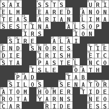 ACROSS 1. Saxophone 4. Fast planes 8. RI univ. 11. Shade tree 12. Having ears or earlike features 14. At once, immediately (arch.) 15. Beverages made from leaves 17. Believer in; advocate of (suffix) 18. Pale green bean 19. French poetic form 21. Columnist Joseph or Stewart 23. Big collection agency 24. Electrically charged atom 25. Father 27. Mountain range southwest of Kyrgyzstan 30. Conclude 31. Sounds asleep 34. Standoff 37. Expire 38. From or relating to Ireland 39. And so on (abbr.) 40. R.R. building 41. Soft color 43. Non-commissioned officer (abbr.) 44. Capri or Wright 45. Pledge 47. Writing tablet 49. Keyboard key 50. Grain storage towers 52. Elected representative 56. Smallest unit of an element 57. Home run 60. Periodic rise and fall of the sea level 61. Round or rotation of duties 62. Tall tales 63. Modern: prefix 64. 4-wheeled motor vehicle 65. Travel on an animal 66. Curvy letter DOWN 1. Arranges properly for use 2. Toward shelter 3. Dec. holiday 4. Actors Connery and Penn 5. "Two Mules for Sister ____" 6. Three (prefix) 7. Ocean 8. The state of being joined or united 9. Frolic 10. _ tizzy (2 wds.) 13. Heredity factor (abbr.) 14. In addition 16. Agitate 20. Angers 22. Cards in a Roman deck? 25. In a ____ (agitated or irritated) 26. It may be bright or harebrained 27. Get up 28. For fear that 29. American tennis player Robert 30. Begley and Asner 32. Pinches, bites 33. Of the mouth 34. Portable shelter 35. Hankering 36. Environmental prefix 42. Grant temporary use of 44. Wedding promise 46. Blind as ____ 47. Peter (Polish) 48. _ mater 49. Laconic 50. Portico 51. Like a shrinking violet 52. Transmit 53. Prong on a fork 54. Lyric poems 55. Vintage cars 56. Curve 58. Boat paddle 59. Medical imaging device (abbr.)