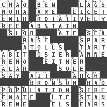 ACROSS 1. US Secretary of Labor Elaine L. _ 5. Benjamin's nick name 8. Fails to keep up a pace 12. Israeli folk dance 13. "We ___ not amused" (Victoria) 14. It is permitted: Lat. 15. Independent ruler or chieftain 16. Happening in regular succession 19. To separate or throw off 20. Choose not to consume 21. Oscar Madison type 23. Had dinner 24. Ocean 27. To erase 30. Coast Guard woman 31. Ringlike coral islands and reefs 34. Small pie 35. "This won't hurt ____!" 38. Flexible twig of a willow tree 40. Queen of England 1702-14 41. San ____ (Riviera town) 42. One or the other of two 44. Having or resembling wings 45. Not divided or shared with others 46. Declare 47. Small island 50. Bowlike part 53. "Death Wish" actor 57. Possessed 59. Census information 63. Beget 64. Maternal 65. Untruth 66. Comedian Laurel of Laurel & Hardy 67. French philosopher Descartes 68. Raised railways 69. Hearing organs DOWN 1. "Mermaids" star 2. Residences 3. Satellite of Uranus 4. Boat paddle 5. Sharp remark 6. Greek god of love 7. Remaining after all deductions 8. 54 in ancient Rome 9. Adept person 10. Set 11. Filthy place 14. Actor's bit 17. Auto club (abbr.) 18. Teat (slang) 20. Blind as ____ 22. Speaker 24. Connect, as a bridge 25. Merit 26. Johnson of "Laugh-In" 28. "Barney Miller" actor Jack 29. Otherwise 30. A viewer who gazes fixedly 32. Cards in a Roman deck? 33. Puts into a specified state 35. Caspian sea tributary 36. Actor Lugosi 37. "If ____ say so..." 39. 17th letter of the Greek alphabet 43. Enthusiasm 47. Competent 48. Retirement account (abbr.) 49. Small child 51. Riviera of "Kiss of the Spider Woman" 52. Ethiopian city, capital of Harari 54. The longest river in the world 55. The visible part of the earth's surface 56. Washington bills 58. Lairs 59. For each 60. Single 61. Baking dish 62. Shoshoni 63. Compass dir.
