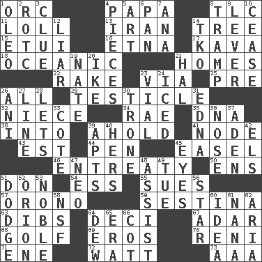 ACROSS 1. The grampus (Milton) 4. Dad 8. Affectionate concern, for short 11. Hang loosely or laxly 13. SW Asia republic 14. Relationship diagram 15. Needle case 16. Inactive volcano in Sicily 17. Polynesian shrub of the pepper family 18. Pertaining to the sea 21. Dwellings 22. Libertine 23. By way of 25. Before (prefix) 26. 100% 29. One of the two male reproductive glands 32. Sibling's daughter 34. Actress Charlotte 35. Heredity factor (abbr.) 38. To the inside or interior of 39. Hold, grip (Informal) 41. Connecting point 43. Eastern Standard Time (abbr.) 44. Animal enclosure 45. Artist's stand 46. Plea 50. Followers of ems 51. Spanish title 54. Curvy letter 55. Takes to court 57. U. of Maine site 59. French poetic form 63. Claim 64. Tenth: prefix 67. The sixth month of the Jewish calendar 68. _ course 69. Greek god of love 70. Painter Guido (1575-1642) 71. Compass dir. 72. Electrical Unit 73. American Automobile Association (abbr.) DOWN 1. Butter sub 2. College mil. group 3. A slight indication 4. Parts 5. Nonscientific branch of learning 6. Baking dish 7. Santa ___, CA 8. _____ steamer (cargo ship) 9. Prying instrument 10. Desist 12. One who doesn't tell the truth 14. Ring climax 19. Nathan's nickname 20. D.D.E's nickname 21. Actor Linden 23. Small bottle 24. On the rocks 26. Cuckoo 27. Actor's bit 28. Allows 30. Marketplace scale 31. Pulitzer Prize-winning author Ferber 33. ____ d'Azur (French Riviera) 36. Characteristic smell of wine 37. An important port of Yemen 39. Tenement units (abbr.) 40. Possessive pronoun 42. Raised railways 45. Sight organs 47. Modern: prefix 48. Help 49. Third day of the wk. 51. Evade 52. Constellation of myth 53. Impressive in appearance 56. Play the lead 58. Overdraft (abbr.) 60. The content of cognition 61. Grandmother 62. Operatic vocal solo 64. Morning condensation 65. Epoch 66. Small bed