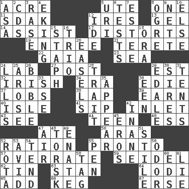 ACROSS 1. Land measure 5. Shoshoni 8. Single 11. Neighbor of Neb. 12. Angers 13. Set 14. Aid 17. What propaganda does 19. Main course 21. Cigar-shaped 22. Greek goddess of the earth (variant) 23. Ocean 24. Experiment locale 27. Mail 29. Eastern Standard Time (abbr.) 32. From or relating to Ireland 34. Period 36. Singer Brickell 37. Tennis shots 38. Pet locale 39. Merit 40. Small island 41. Small drink 42. An arm off of a larger body of water 43. Observe 44. Adolescent 46. Double-curved letter 47. Had dinner 50. Ancient river in northeast Turkey 52. Food allowance for one day 55. Right away 57. Make much ado about nothing 59. Beer mug 62. Metal container 63. Comedian Laurel of Laurel & Hardy 64. Farming town in central California 65. Increase 66. Barrel 67. Celtic language DOWN 1. White ___ sheet 2. Music discs 3. Raze (variant) 4. Supplementing with great effort 5. RI univ. 6. Trials 7. First name in cosmetics 8. Legendary monster 9. Remaining after all deductions 10. Otherwise 12. Binary compound 15. Staphylococcus 16. Musical group of three 18. Mouth or opening 20. Artist's stands 24. Ms. Damita and namesakes 25. Came up 26. The Good Book 28. Distinguishing feature 29. Peak District village in England 30. Begets 31. Portable shelters 33. Compass dir. 35. Become visible 36. Car or cant ending 42. Silly 45. Greek god of love 47. Wind 48. Cod relative 49. Related on the mother's side 51. Vertical member of a panel or frame 52. Round or rotation of duties 53. Enthusiastic 54. Watch over 55. Writing instrument 56. Scent 58. Label 60. Begley and Asner 61. Whopper