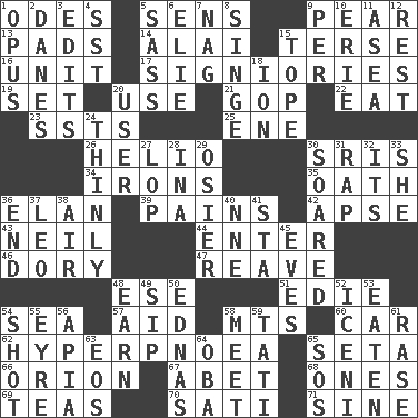 ACROSS 1. Lyric poems 5. Elected reps. 9. Lightbulb-shaped fruit 13. Groovy apts. 14. Jai _ 15. Laconic 16. A single undivided whole 17. Seigniories (variant) 19. Arrange properly for use 20. Purpose 21. Republican Party 22. Consume 23. Fast planes 25. Compass dir. 26. Sun: prefix 30. Indian titles of respect 34. Metal shackles 35. Pledge 36. Flair 39. Aches 42. Domed church section 43. Famous astronaut Armstrong 44. Keyboard key 46. Dinghy 47. Rob, plunder, or pillage 48. Compass dir. 51. Singer Brickell 54. Ocean 57. Help 58. Mountains (abbr.) 60. Automobile 62. Abnormally rapid or deep breathing 65. Stalk of a moss capsule 66. Greek mythologigal hunter 67. Collude with 68. Washington bills 69. Afternoon social gatherings 70. Suttee (variant) 71. Trig term DOWN 1. Musical composition 2. Natives or inhabitants of Denmark 3. Prepares for publication 4. Fast jet (abbr.) 5. Backtalk 6. Writer Wiesel 7. Tired old horse 8. Scorch 9. For each 10. 4th largest of the Great Lakes 11. At sea 12. Respite 15. Drink excessively 18. Electrically charged atom 20. One who uses or employs something 24. Without force or sincere effort 27. Trim (branches) 28. _ tizzy (2 wds.) 29. Flexible twig of a willow tree 30. Flew 31. Strike 32. ___ a Wonderful Life 33. A female animal or person 36. Conclusion 37. Lion 38. Wind 40. Compass dir. 41. R.R. building 45. Nights before holidays 48. Merit 49. Small drink 50. Ferber et al. 52. Ancient Celtic tribe of eastern Britain 53. Consumed 54. Opportunity 55. Jane of fiction 56. Capital of Western Samoa 58. Rendezvous 59. Jacques of French films 61. To erase 63. Greek goddess of the dawn 64. Chief or king in Benin or Nigeria 65. Mayday
