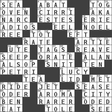 ACROSS 1. Ocean 4. Blind as ____ 8. Coat; cloak 11. Baking chamber 13. High-altitude cloud 15. Alias (abbr.) 16. Drug cop 17. _____ Park, CO 18. 4th largest of the Great Lakes 19. Goodbye (Sp.) 21. Snakelike fish 22. Christmas carol 23. To sift 24. Small child 27. Bank Draft (abbr.) 29. Pace 30. Nick name for Arthur 34. Shoshoni 36. Labels 39. Break or tear apart 40. Ooze 41. Declaim 43. Actor Alda or Thicke 44. Columnist Joseph or Stewart 46. In a ____ (agitated or irritated) 47. Nine, plus one 48. _ dish (used to culture cells) 49. "I Love _" 51. Beverage made from leaves 53. Hat (slang) 54. Was introduced to 57. Travel on or in a vehicle 60. Type of plane 63. Gospel singer Marvin 65. Baltic tributary 66. Odor 69. Municipality 70. Benjamin's nick name 71. More uncommon 72. Wrote a lyric poem 73. Consume 74. Lacquered or enameled metalware 75. Observe DOWN 1. Underwater navigation system 2. Elude 3. Nest on high 4. Adept person 5. Altar cloth linen 6. Johnson of "Laugh-In" 7. Relationship diagram 8. Pacific island yam 9. Migrant worker of the '30s 10. Highlander 12. Non-commissioned officer (abbr.) 14. Small island 18. Plea 20. R.R. building 25. Von Bismarck 26. Separates forcefully 28. At a great distance 29. News announcer 31. Falsehood 32. _ the terrible 33. Car or cant ending 34. Ubangi River tributary 35. Trial 37. Separate the seeds from cotton 38. Free from disturbance or agitation 40. Plant excrement 42. Needle holder 45. Sliced dessert 50. Music discs 52. Partly open 54. Women servants 55. First name in cosmetics 56. Miss Universe 1986, Barbara Palacios _ 57. Loose flowing garment 58. The main thing one is thinking about 59. Incision 61. Part of Q.E.F. 62. "Corrida" creature 64. Environmental prefix 67. Cartoonist voice _ Blanc 68. "We ___ not amused" (Victoria)