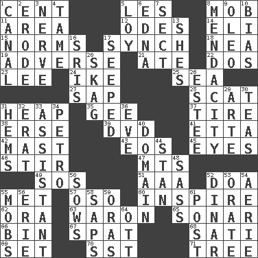 ACROSS 1. Penny 5. French article 8. Crowd into 11. Type of rug 12. Lyric poems 14. Biblical high priest 15. Typical models 17. Synchronize (abbr.) 18. Teachers' org. 19. Contrary to your interests or welfare 21. Had dinner 22. Two (Sp.) 23. Area sheltered from the wind 24. Eisenhower's nickname 25. Ocean 27. Plant excrement 28. Jazz singing style 31. Pile 35. Turn to the right 37. Become fatigued 38. Celtic language 39. Movie disc 41. Singer James 42. Vertical spar for supporting sails 43. Greek goddess of the dawn 45. Sight organs 46. Move through with a circular motion 47. Mountains (abbr.) 49. Distress signal 51. American Automobile Association (abbr.) 52. ___ good deed 55. Was introduced to 57. Bear (Spanish) 60. Heighten or intensify 62. Mouth or opening 63. Make _____ (do battle with) 65. Echolocation 66. Storage container 67. Petty quarrel 68. Suttee (variant) 69. Put into a specified state 70. Fast jet (abbr.) 71. Relationship diagram DOWN 1. Lessep's creation 2. Eat (away) 3. Effrontery 4. Not wild 5. Myrna of the movies 6. Pulitzer Prize-winning author Ferber 7. Religious group 8. Ananias' fault 9. Butter sub 10. Prejudice 13. "______ My Girl" (Turtles hit) 16. Indian titles of respect 17. Oozed 20. Heroin 26. First name in cosmetics 29. Johnson of "Laugh-In" 30. Beverages made from leaves 31. Cloth borders 32. Part of Q.E.F. 33. Helper 34. Stone: prefix 36. First lady 40. Realm 44. Comedian Laurel of Laurel & Hardy 48. Backtalk 50. Sty mamas 52. Middle Eastern gold or silver currency 53. Declaim 54. Nest on high 55. Crowds into 56. One of the Great Lakes 58. Plant excrements 59. Mouths or openings 61. Mail 64. Baseball player Mel