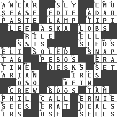 ACROSS 1. Approach 6. Stealthy 9. Australian flightless bird 12. Gospel singer Marvin 13. Singer Brickell 14. The sixth month of the Jewish calendar 15. Thick mixture 16. Desk light 17. Native american tent (variation) 18. Area sheltered from the wind 19. "____ silly question..." 20. Tennis shots 21. Cause heat under the collar 23. Pipe bend 24. Fast planes 25. Bobsleighs 28. Biblical high priest 30. Having a sole or soles 34. Fastener 35. Label 36. Mexican monetary units 38. Epoch 39. Prong on a fork 41. Writing tables 43. Put into a specified state 44. Believer in; advocate of (suffix) 46. Angers 48. Bear (Spanish) 49. Distinctive style or manner 50. Group working together 51. Scornful sounds 53. Scottish cap 56. Silvers or Donahue 57. Give a ring to 58. Bert's buddy 60. Observes 61. Part of Q.E.F. 62. Allots cards 63. Big collection agency 64. Order of Saint Francis (abbr.) 65. Exchanges for money DOWN 1. Cleo's killer 2. Be tempered by heat 3. Relaxation 4. Michaelmas daisies 5. To separate or throw off 6. Neighbor of Neb. 7. Pale green bean 8. Slangy assent 9. The property of being fit to eat 10. Atlas contents 11. RI univ. 13. Otherwise 14. Ringlike coral islands and reefs 19. Columnist Joseph or Stewart 20. French article 22. ___ a Wonderful Life 24. Seigniories (variant) 26. Have the gumption 27. Argument over a trivial matter 28. Singer James 29. Den 31. Directed 32. Compass dir. 33. Two (Sp.) 37. Atmospheres 40. Artist's stands 42. _ Lanka 45. At this time 47. Main course 49. Electrical Unit 50. "Mermaids" star 51. Soap units 52. Norwegian king 54. Of or related to the anus 55. Place where flour is made 56. 23rd letter of the Greek alphabet 57. Corporate head (abbr.) 58. Begley and Asner 59. Double-curved letter