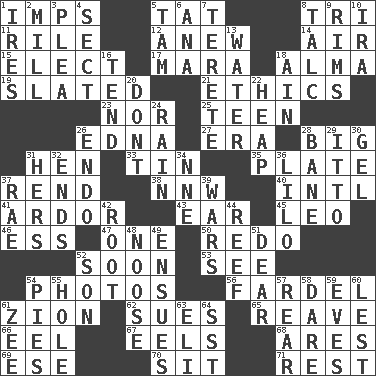 ACROSS 1. Naughty children 5. Make lace 8. Three (prefix) 11. Cause heat under the collar 12. Afresh 14. Wind 15. Choose 17. Hindu Mythology: god of death 18. _ mater 19. Scheduled 21. Principles of right and wrong 23. And not 25. Adolescent 26. Pulitzer Prize-winning author Ferber 27. Epoch 28. Massive 31. Layer 33. Shallow baking pan 35. Food holder 37. Tear apart 38. Compass dir. 40. International (abbr.) 41. Zeal 43. Hearing organ 45. Lion 46. Double-curved letter 47. Single 50. Make new 52. Within a short period 53. Observe 54. Pictures 56. Pack 61. The Jewish people; Israel 62. Takes to court 65. Rob, plunder, or pillage 66. Snakelike fish 67. Snakelike fish 68. Ancient Greek god of war 69. Compass dir. 70. Be seated 71. Respite DOWN 1. Angers 2. Place where flour is made 3. Entreaty 4. Religious group 5. Scottish cap 6. Santa ___, CA 7. Cigar-shaped 8. Baby powder 9. Basketball hoops 10. Lyricist Gershwin 13. Wetness 16. Watch over 18. The 18th letter of the Arabic alphabet 20. Do not 22. Pile 24. Water falling in drops from the sky 26. Inside; within (prefix) 28. Object of repulsion 29. "Tell ____ the Marines!" 30. Set 31. Possessive pronoun 32. Conclusions 34. Compass dir. 36. _ and Stitch 37. Actress Charlotte 39. Armed conflicts 42. Carrot, for example 44. Coral collection 48. Trap for birds or small mammals 49. Follows as a consequence or result 51. Letter starter 52. Male child 54. Sliced desserts 55. Hollow 57. Rump 58. Have the gumption 59. Nights before holidays 60. For fear that 61. Last letter of the English alphabet 63. Connecticut Ivy Leaguer 64. Fast jet (abbr.)