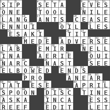 ACROSS 1. Small drink 4. Bristle 8. Nights before holidays 12. Single 13. Implement 14. Mediterranean tributary 15. Long (Scottish) 17. Pismires 18. Stop 19. World-weariness 21. Lubricate 23. French article 24. 1973 Nobel Price Winner (Physics) Leo 26. Teat (slang) 28. Ancient Persian 30. Contrary to your interests or welfare 34. Experiment locale 37. Independent ruler or chieftain 39. 1994 drama film starring Jodie Foster 40. _ tizzy (2 wds.) 41. Nest on high 43. Fr. "Yes" 44. Drug cop 46. Political cartoonist Thomas 47. Observe 48. Shoved, as through a crowd 51. Conclusions 54. Adept person 55. Approach 58. Make lace 61. Compass dir. 63. Showery time 65. Soup utensil 67. Plate 71. Prong on a fork 72. "____ silly question..." 73. South American Indian 74. Double-curved letter 75. Coral collection 76. Prepare for publication 77. Allow DOWN 1. Flatfish 2. Lacking in sense or substance 3. Actor Sean's family 4. R.R. building 5. Age 6. Small child 7. In addition 8. Compass dir. 9. Small bottle 10. Otherwise 11. Perceives with the eye 16. Island territory of the United States 18. 154 in Roman numerals 20. Eisenhower's nickname 22. It would 25. The content of cognition 27. Nine, plus one 29. Make improvements or corrections to 30. Get up 31. Vintage cars 32. Turn sharply 33. Writer Wiesel 34. Actor's bit 35. Of or related to the anus 36. Sharp remark 38. Lyricist Gershwin 42. Inactive volcano in Sicily 45. Police officer (slang) 49. Songbird 50. Greek goddess of the dawn 52. Heredity factor (abbr.) 53. Back-to-school mo. 56. Satellite of Uranus 57. Wash lightly 58. Russian ruler of old 59. Domed church section 60. Puff or smoke 62. Singer Brickell 64. For fear that 66. Clumsy lout 68. Indiana (abbr.) 69. _-fi 70. Domesticated feline