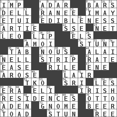 ACROSS 1. Mischievous child 4. The sixth month of the Jewish calendar 8. Long, evenly shaped pieces 12. Small valley 14. Indian princess (variant) 16. "If ____ say so..." 17. Needle case 18. The property of being fit to eat 20. Nick name for Arthur 22. Compass dir. 23. Fish or hair follower 24. Lion 25. Mouth edge 28. Raised railways 30. Mine, in Marseilles 31. Check the growth or development of 35. Keyboard key 37. Good sense 40. Jai ____ 41. 1994 drama film starring Jodie Foster 42. Remove all contents or possession from 44. Assign a rank or rating to 45. Comfort 46. Cause heat under the collar 47. Compass dir. 48. Came up 50. Den 52. Ring climax 54. _ Lanka 55. French article 58. Period 61. Biblical high priest 63. From or relating to Ireland 65. Dwellings 70. Von Bismarck 71. An important port of Yemen 72. Dwarf 73. Fermented drink made from hops 74. Frog relative 75. Surprise greatly 76. Portuguese money of account (variant) DOWN 1. Perfect 2. Distance measurement (Brit.) 3. Mickey's pet 4. "We ___ not amused" (Victoria) 5. June honoree 6. Cuckoo 7. Confederate soldiers (slang) 8. Storage container 9. So be it 10. To erase 11. System (abbr.) 13. Cards in a Roman deck? 15. Otherwise 19. Snakelike fish 21. Shade tree 26. Charged particles 27. Peter (Polish) 29. A viewer who gazes fixedly 30. Most capable 32. ____ Bator, Mongolia 33. Nathan's nickname 34. Make a knot 35. Rend 36. In addition 38. RI univ. 39. Beverly of Met fame 41. Teachers' org. 43. Lightbulb-shaped fruit 49. Supplemented with great effort 51. One more than two 53. Cassini of fashion 55. 61 cubic inches 56. First name in cosmetics 57. Dinah or Pauly 58. Part of Q.E.F. 59. Make new 60. Toward the sea 62. Lodging establishments 64. Director Reiner 66. Working for oneself (abbr.) 67. Small bed 68. Australian flightless bird 69. Elected rep.