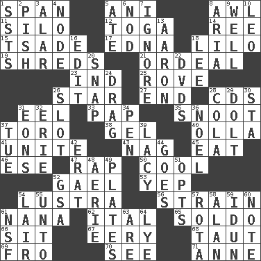 ACROSS 1. Connect, as a bridge 5. Black tropical American cuckoo 8. Leather borer 11. Grain storage tower 12. Ancient Roman robe 14. To sift 15. Sadhe (variant) 17. Pulitzer Prize-winning author Ferber 18. _ and Stitch 19. Tears up 21. Severe or trying experience 23. Indiana (abbr.) 25. Be footloose 26. Play the lead 27. Conclusion 28. Music discs 31. Snakelike fish 33. Infant food 35. Snout, nose 37. "Corrida" creature 38. Set 40. Spanish pot 41. Join together 43. Tired old horse 45. Ingest 46. Compass dir. 47. Hit sharply and swiftly 50. Calm and collected 52. Highlander 53. Slangy assent 54. A period of five years 56. Put through a sieve 61. Nanny 62. Slanted text style (abbr.) 65. Twentieth part of a lira 66. Be seated 67. Suggestive of the supernatural 68. Strained 69. From 70. Perceive with the eye 71. Singer Murray DOWN 1. Fast planes 2. Expression of disdain 3. Having or resembling wings 4. Thickened enlargement 5. Had dinner 6. Dreamland 7. Disregard 8. Roberta Peters solo 9. Not ill 10. Lion 13. Composer Copland 16. Prepare for publication 18. Area sheltered from the wind 20. Fastener 22. Movie discs 24. To draw with force 26. Narrow, elongated depression 28. Root beer relative 29. Stupid person 30. R.R. building 31. Immeasurably long periods of time 32. One of the Great Lakes 34. Fenced enclosure 36. Christmas carol 37. Third day of the wk. 39. Made of lace 42. Part of Q.E.F. 44. Moves 48. Nest on high 49. Food holders 51. Chooses 52. Girls' org. (abbr.) 54. Den 55. To (old English) 57. Roll call or roster of names 58. Actor Alda or Thicke 59. Goddess of spring and wife of Bragi 60. Musical sound 61. Science/research agcy. 63. "We ___ not amused" (Victoria) 64. Sodium hydroxide