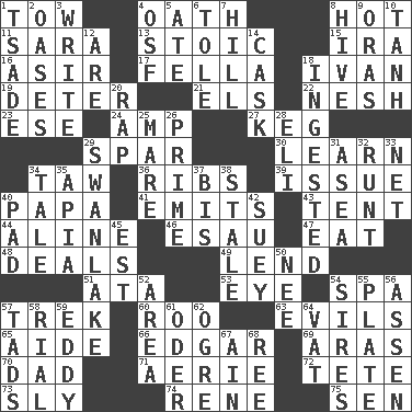 ACROSS 1. Pull behind 4. Pledge 8. Being at a high temperature 11. "Two Mules for Sister ____" 13. Unemotional 15. Lyricist Gershwin 16. SW Saudi Arabia district 17. Chap (slang) 18. "Terrible" tsar 19. Prevent from occurring 21. Raised railways 22. Delicate 23. Compass dir. 24. Electrical Unit 27. Barrel 29. Practice fight 30. Acquire or gain knowledge or skills 34. The 23rd letter of the Hebrew alphabet 36. Chest bones 39. Come out of 40. Dad 41. Gives off 43. Portable shelter 44. Place in a line 46. He sold his birthright 47. Erode 48. Allots cards 49. Grant temporary use of 51. "One Day ___ Time" 53. Sight organ 54. Health resort 57. Long journey 60. Friend of Pooh 63. Vices 65. Assistant 66. _ Allan Poe 69. Ancient river in northeast Turkey 70. June honoree 71. Nest on high 72. Wig 73. Cunning 74. French philosopher Descartes 75. Elected rep. DOWN 1. Sadhe (variant) 2. Fertile tracts in a desert 3. Compose 4. Order of Saint Francis (abbr.) 5. Had dinner 6. Lacquered or enameled metalware 7. Land elevation 8. Hub of activity 9. Mouths or openings 10. Hyperbolic tangent 12. "We ___ not amused" (Victoria) 14. Keg 18. Consumed 20. Reproach for some lapse or misdeed 25. Female horse 26. First class 28. Biblical high priest 29. Tchaikovsky ballet 31. Toward the sea 32. Undersized animal 33. Fish or hair follower 34. Lie 35. Capital of Western Samoa 37. Twice 38. Having lost freshness 40. Groovy apt. 42. Chop _ 45. Eastern Standard Time (abbr.) 50. Born 52. Length times width 54. Founders of families 55. Food holder 56. NE Netherlands city 57. Small amounts or degrees 58. Monetary unit of Yemen 59. Whirlpool 61. River in Europe 62. Legendary monster 64. Large container 67. The 18th letter of the Arabic alphabet 68. To separate or throw off
