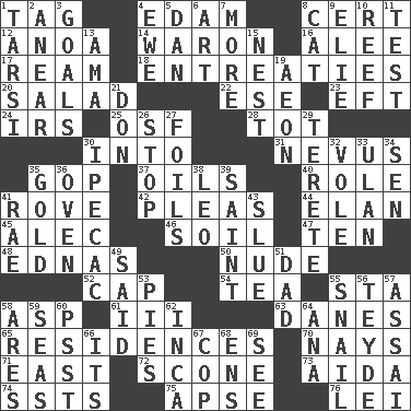ACROSS 1. Label 4. Dutch treat 8. Foregone conclusion 12. Small Philippine buffalo 14. Make _____ (do battle with) 16. Toward shelter 17. 480, 500 or 516 sheets of paper 18. Pleas 20. First course 22. Compass dir. 23. Lizard (obsolete) 24. Big collection agency 25. Order of Saint Francis (abbr.) 28. Small child 30. To the inside or interior of 31. Mole, birthmark 35. Republican Party 37. Lubricates 40. Hero or heavy, e.g. 41. Be footloose 42. Entreaties 44. Liveliness 45. Actor Baldwin 46. The visible part of the earth's surface 47. Nine, plus one 48. Ferber et al. 50. Unadorned 52. Head covering 54. Beverage made from leaves 55. R.R. building 58. Cleo's killer 61. One more than two 63. Natives or inhabitants of Denmark 65. Homes 70. Negative votes 71. Compass direction 72. Biscuitlike quick bread 73. Opera by Verdi 74. Fast planes 75. Domed church section 76. Flowery wreath DOWN 1. Tarsus (plural) 2. Approach 3. Scores awarded for successful feats 4. She-sheep 5. One of the 12 tribes of Israel 6. Tate display 7. Greater amount 8. Feline 9. Writer Wiesel 10. Coral ridge 11. Trial 13. Nanny (var.) 15. A home for chicks 19. Period of immesurable duration 21. Spanish title 26. Cease 27. Fencing necessities 29. Cylindrical with tapered ends 30. Medicinal drug used to evoke vomiting 32. Short-tailed, large-bodied rat 33. ____ Bator 34. Elected rep. 35. Aureate 36. Baking chamber 38. Lion 39. Inhabitant of Heaven 41. Actress Charlotte 43. Change direction abruptly 49. Alleged 51. June honoree 53. Sliced desserts 55. Slow-paced one 56. Miss Universe 1986, Barbara Palacios _ 57. Slender Brazilian palm 58. Ancient Greek god of war 59. Oceans 60. Inconspicuous attention getter 62. South American Indian 64. Santa ___, CA 66. It is 67. Police officer (slang) 68. Followers of ems 69. Perceive with the eye