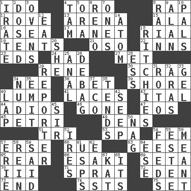 ACROSS 1. Wedding promise 4. "Corrida" creature 8. Reproach for some lapse or misdeed 11. Be footloose 13. Sports stadium 15. In the manner of 16. Toward the sea 17. French painter Edouard 18. Monetary unit of Yemen 19. Portable shelters 21. Bear (Spanish) 22. Lodging establishments 23. Begley and Asner 24. Possessed 27. Was introduced to 29. French philosopher Descartes 30. Lean end of the neck 34. Born 36. Collude with 39. Dinah or Pauly 40. Mass 41. Shoestrings 43. Slanted text style (abbr.) 44. Goodbye (Sp.) 46. Went 47. Greek goddess of the dawn 48. _ dish (used to culture cells) 49. Lairs 51. Three (prefix) 53. Health resort 54. Opposite of masc. 57. Celtic language 60. Regret 63. Honkers 65. Posterior 66. 1973 Nobel Price Winner (Physics) Leo 69. Stalk of a moss capsule 70. One more than two 71. Small fatty European fish 72. Genesis locale 73. Conclude 74. Fast planes 75. Arrange properly for use DOWN 1. Feeling or showing extreme anger 2. Administered medicine 3. Baking chambers 4. Scottish cap 5. Mouth or opening 6. Western Nevada city 7. Singles 8. Water falling in drops from the sky 9. Actor Alda or Thicke 10. Friends 12. Consume 14. Smallest unit of an element 18. Actors Guy, Robert Welles, and Clint 20. A female animal or person 25. Of or related to the anus 26. Debunk (Brit. slang) 28. Curvy letter 29. Newsperson 31. Printing process, for short 32. Caspian sea tributary 33. Set 34. Naked 35. Give off 37. Environmental prefix 38. Looks after 40. Pet locale 42. Ooze 45. Title for a knight 50. Tired old horse 52. Angers 54. Eats 55. First name in cosmetics 56. Intended 57. 4th largest of the Great Lakes 58. It's straight from the horse's mouth 59. Stated 61. United States Postal Service (abbr.) 62. Hearing organs 64. Compass dir. 67. Krazy ___ of comics 68. ___ a Wonderful Life