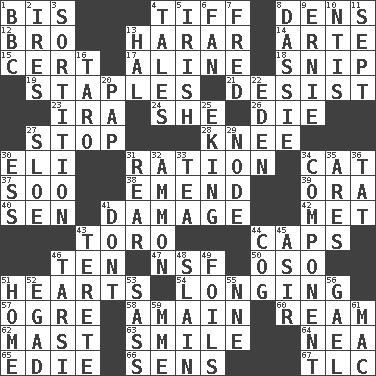 ACROSS 1. Altar cloth linen 4. Small quarrel 8. Hiding places for outlaws 12. Sis' sibling 13. Ethiopian city, capital of Harari 14. Johnson of "Laugh-In" 15. Foregone conclusion 17. Place in a line 18. Sever or remove by pinching or nipping 19. Paper fasteners 21. Cease 23. Retirement account (abbr.) 24. A female animal or person 26. Pass on 27. Cease 28. Leg joint 30. Connecticut Ivy Leaguer 31. Food allowance for one day 34. Domesticated feline 37. "Barney Miller" actor Jack 38. Make improvements or corrections to 39. Mouth or opening 40. Elected rep. 41. Break 42. Was introduced to 43. "Corrida" creature 44. Smile enhancers 46. "___ Little Indians" 47. Overdraft (abbr.) 50. Bear (Spanish) 51. Centers of feelings and intuitions 54. Yearning 57. Legendary monster 58. At full speed 60. 480, 500 or 516 sheets of paper 62. Vertical spar for supporting sails 63. Grin 64. Teachers' org. 65. Singer Brickell 66. Elected reps. 67. Affectionate concern, for short DOWN 1. English channel? 2. Angers 3. Decision 4. Stories 5. From or relating to Ireland 6. Air blower 7. Flintstone 8. Small ungulate mammals of Africa 9. Bert's buddy 10. Nuclear Threat Initiatives 11. Back-to-school mo. 13. Actor Linden 16. Edible starchy tuberous root 20. Infant food 22. Paradise 25. Supplementing with great effort 27. _ gin 29. Thickened enlargement 30. Double-curved letter 31. Stern 32. ID or VA city 33. Afternoon social gathering 34. Part 35. Ancient Greek god of war 36. Make lace 41. Do not 43. Cylindrical with tapered ends 44. Gear tooth 45. SW Saudi Arabia district 46. Tarsus (plural) 48. Killed 49. Fencing necessities 51. Residence 52. Mild oath 53. Backtalk 55. Compass dir. 56. Highlander 59. Madame (abbr.) 61. Apple computer (short form)
