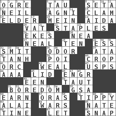 ACROSS 1. Legendary monster 5. The 19th letter of the Greek alphabet 8. Bristle 12. Famous astronaut Armstrong 13. Hindu god of fire 15. Burrowing marine mollusk 16. A person who is older than you are 18. Chow _ 19. Opera by Verdi 20. Large container 22. Paper fasteners 24. Supplements with great effort 26. Teachers' org. 27. Actress Patricia 28. Nine, plus one 29. Double-curved letter 32. Stricken, poetically 35. Aroma 37. _ moment's notice (2 wds.) 38. Hyperbolic tangent 39. Luau course 40. Riding implement 41. The grampus (Milton) 42. Welt 43. United States Postal Service (abbr.) 44. Auto club (abbr.) 45. Flaplike covering 46. Engineer (abbr.) 49. Car or cant ending 50. Drawn tight 51. Mood resulting from idleness 55. Girls' org. (abbr.) 56. Merit 57. Mouths or openings 59. Likely to tip or tilt 63. Jai ____ 64. Armed conflicts 65. Nathan's nickname 66. Prong on a fork 67. Allow 68. Fastener DOWN 1. Single 2. Set 3. To free from 4. Veterans Day date 5. Scottish cap 6. Eras 7. A single undivided whole 8. Any of the three canals of the cochlea 9. Writer Wiesel 10. Small amounts or degrees 11. Nanny (var.) 14. More empty; more void 17. Libertine 21. Beverage made from leaves 23. Animal enclosure 25. Had an oblique or slanted direction 28. Bathroom 29. Hearing organs 30. Obstruct or block passage 31. Plant excrements 32. Portico 33. Hindu Mythology: god of death 34. South American Indian 36. ___ good deed 40. Window treatments 42. Light entry point 45. Area sheltered from the wind 47. Tired old horse 48. Abrupt rush of wind 49. Bert's buddy 51. Indonesian resort city 52. NW Algerian seaport 53. Of the mouth 54. Female horse 56. Ingest 58. Fast jet (abbr.) 60. Baking dish 61. Parent Teacher Association (abbr.) 62. Slangy assent