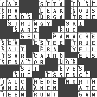ACROSS 1. Head covering 4. Bristle 8. Otherwise 12. Mouth or opening 13. Path through which fluid escapes 14. Horse sense 15. Depends 18. Capital and largest city of Mongolia 19. Woody plant 20. Slender, wiry 22. Indian title of respect (Mr.) 23. Indian skirt 24. Sorrow 25. Set 26. Flamboyance 30. Ocean 33. First name in cosmetics 36. Loyal 37. Table seasoning 39. Epoch 40. Shout 41. Russian ruler of old 42. Capital of Egypt 44. Raised railways 45. Legislator 47. And not 50. Be seated 51. Nights before holidays 53. A female animal or person 54. Substance 57. Baby powder 59. Ancient Persian 61. _ pole 63. Small Philippine buffalo 64. So be it 65. Had dinner 66. Adolescent 67. The smallest animal of a litter 68. Separate the seeds from cotton DOWN 1. Police officer (slang) 2. Ancient Greek god of war 3. Leg coverings 4. Snaillike creature with no shell 5. Suggestive of the supernatural 6. Label 7. Alias (abbr.) 8. Plea 9. Australian parrot (variant) 10. Institute legal proceedings 11. Compass dir. 16. To trail on the ground 17. Beget 21. Mediterranean tributary 22. Player for Phoenix 24. Actress Charlotte 26. Lightbulb-shaped fruit 27. Algonquian 28. Frame or body of a ship 29. Snakelike fish 30. Fast planes 31. Comfort 32. Actor Alda or Thicke 34. Singe 35. Three (prefix) 38. File 13 42. Small bed 43. Washington bills 46. Neckwear 48. Baking chamber 49. Former U.S. Attorney General Janet 52. Lean end of the neck 53. A type of plum 54. Locale of original sin 55. Transmitted 56. Singer James 57. Make lace 58. A saturated hydrocarbon 59. Third mo. 60. Australian flightless bird 62. Layer