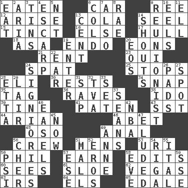 ACROSS 1. Consumed 6. 4-wheeled motor vehicle 9. To sift 12. Originate 13. Root beer relative 14. Sew up the eyelids of hawks and falcons 15. Colored lightly or faintly 16. Otherwise 17. Frame or body of a ship 18. White ___ sheet 19. Inside; within (prefix) 20. Immeasurably long periods of time 21. Monthly bill 23. Fr. "Yes" 24. Petty quarrel 25. Halts 28. Biblical high priest 30. Musical pauses 34. Fastener 35. Label 36. All-night dance parties 38. Wedding promise 39. Prong on a fork 41. Eucharist need 43. Fast jet (abbr.) 44. Believer in; advocate of (suffix) 46. Collude with 48. Bear (Spanish) 49. Of or related to the anus 50. Ship's personnel 51. Not women's 53. RI univ. 56. Silvers or Donahue 57. Merit 58. Proofreads 60. Observes 61. _ gin 62. Viva Las _ 63. Big collection agency 64. Raised railways 65. Peak District village in England DOWN 1. Ingest 2. Roberta Peters solo 3. Metal containers 4. Fortification 5. Fish or hair follower 6. Having a low temperature 7. In addition 8. Actress Charlotte 9. One who advocates reunion 10. Snakelike fish 11. Pipe bend 13. Penny 14. Yells 19. Keyboard key 20. Greek goddess of the dawn 22. Hearing organ 24. Seigniories (variant) 26. Writing tablets 27. Specific locale 28. Singer James 29. Den 31. Plant excrement 32. Federal power corp. 33. Arrange properly for use 37. Seines 40. Artist's stands 42. Basketball assoc. 45. At this time 47. Evaded 49. Queen of England 1702-14 50. "Mermaids" star 51. Promenade 52. Greek god of love 54. Port city in Latvia 55. Slanted text style (abbr.) 56. 23rd letter of the Greek alphabet 57. Compass dir. 58. Night before a holiday 59. Compass dir.