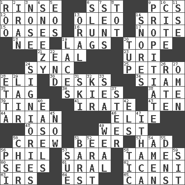 ACROSS 1. Wash lightly 6. Fast jet (abbr.) 9. Personal Computers (abbr.) 12. U. of Maine site 13. Butter sub 14. Indian titles of respect 15. Fertile tracts in a desert 16. Undersized animal 17. Brief written record 18. Born 19. Falls behind 20. Drink excessively 21. Ardor 23. RI univ. 24. Synchronize (abbr.) 25. Stone: prefix 28. Connecticut Ivy Leaguer 30. Writing tables 34. Thailand, formerly 35. Label 36. Atmospheres 38. Had dinner 39. Prong on a fork 41. Feeling or showing extreme anger 43. "___ Little Indians" 44. Believer in; advocate of (suffix) 46. Writer Wiesel 48. Bear (Spanish) 49. Compass direction 50. Ship's personnel 51. Fermented drink made from hops 53. Possessed 56. Silvers or Donahue 57. "Two Mules for Sister ____" 58. Softens 60. Perceives with the eye 61. Mountain range 62. Ancient Celtic tribe of eastern Britain 63. Big collection agency 64. Eastern Standard Time (abbr.) 65. 2nd pers. sing. pres. of can (arch.) DOWN 1. Friend of Pooh 2. SW Asia republic 3. Characteristic smell of wine 4. Dwarf with a sinus problem 5. Greek goddess of the dawn 6. Strike heavily 7. Elected reps. 8. Small child 9. Conciliate 10. Quote 11. Compass dir. 13. Of the mouth 14. Sounds asleep 19. Shoestrings 20. Uncastrated adult male sheep 22. Conclude 24. Seigniories (variant) 26. Pace 27. Sign of things to come 28. Singer James 29. Den 31. What Jean-Claude Killy likes to do 32. Apertif with cassis 33. Ocean 37. Guide 40. Artist's stands 42. Raised railways 45. At this time 47. New York city 49. Welt 50. "Mermaids" star 51. Oblong pieces of solid material 52. Part of Q.E.F. 54. So be it 55. Cub Scout units 56. 23rd letter of the Greek alphabet 57. Take to court 58. Nervous spasm 59. Be seated