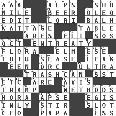 ACROSS 1. Auto club (abbr.) 4. High mountains 8. Quiet! 11. "Death on the ____" 13. Fermented drink made from hops 14. Butter sub 15. Prepare for publication 16. Australian parrot (variant) 17. Lip ointment 18. Electrical Measurement 21. Eating place 22. Ancient Greek god of war 23. Biblical high priest 25. Mayday 26. Sep. follower 29. Plea 32. Plants 34. Shade tree 35. Compass dir. 38. Ballerina skirt 39. Gospel singer Marvin 41. Path through which fluid escapes 43. Car or cant ending 44. The grampus (Milton) 45. Extreme 46. File 13 50. Fast jet (abbr.) 51. And so on (abbr.) 54. "We ___ not amused" (Victoria) 55. Deliberation 57. _____ steamer (cargo ship) 59. Modes 63. Israeli folk dance 64. Domed church section 67. The front part of a cuirass 68. In an inward manner 69. Commotion 70. Notch 71. Corporate head (abbr.) 72. Dad 73. Curvy letter DOWN 1. Afresh 2. Opera by Verdi 3. Set down 4. Most capable 5. Lion 6. For each 7. _ Lanka 8. Broad, flat, thick pieces 9. Phone greeting 10. Residences 12. Singer James 14. Chief or king in Benin or Nigeria 19. Type of rug 20. Commissioned military rank (abbr.) 21. Teat (slang) 23. Snakelike fish 24. Unable to walk 26. Often (poetically) 27. A slight indication 28. Carry 30. Arrive at 31. Shout 33. The smallest animal of a litter 36. Puts into a specified state 37. Hearing organs 39. Fly high 40. Celtic language 42. Krazy ___ of comics 45. A single undivided whole 47. Reproach for some lapse or misdeed 48. Device for capturing images 49. "___ Maria" 51. Principle of right and wrong 52. Heavy duty weighing machine 53. Monte _, Las Vegas Hotel/Casino 56. "______ My Girl" (Turtles hit) 58. Can I? 60. Stare 61. "Vaya con ____" 62. Fast planes 64. Cleo's killer 65. Parent Teacher Assoc. 66. Small drink