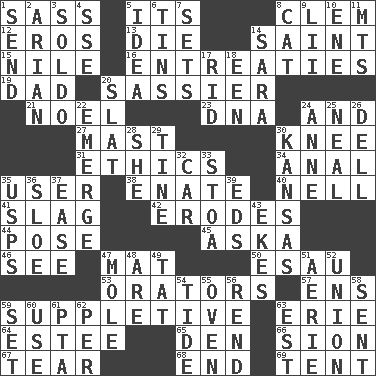 ACROSS 1. Backtalk 5. ___ a Wonderful Life 8. Clement's nick name 12. Greek god of love 13. Pass on 14. Virtuous person 15. "Death on the ____" 16. Pleas 19. Male parent 20. More lively and spirited 21. Christmas carol 23. Heredity factor (abbr.) 24. Plus 27. Vertical spar for supporting sails 30. Leg joint 31. Value system 34. Of or related to the anus 35. One who uses or employs something 38. Related on the mother's side 40. 1994 drama film starring Jodie Foster 41. Volcanic refuse 42. Eats (away) 44. Airs 45. "____ silly question..." 46. Perceive with the eye 47. Floor covering 50. Son of Isaac 53. Speakers 57. Followers of ems 59. Supplementary 63. One of the Great Lakes 64. First name in cosmetics 65. Lair 66. The Jewish people; Israel 67. Rend 68. Conclusion 69. Portable shelter DOWN 1. Transmit 2. Believer in; advocate of (suffix) 3. Twentieth part of a lira 4. Compass dir. 5. The main thing one is thinking about 6. Airtight sealed metal containers 7. Puts into a specified state 8. Feline 9. Cards in a Roman deck? 10. Compass dir. 11. Mountains (abbr.) 14. "Two Mules for Sister ____" 17. To free from 18. Car or cant ending 20. Narrow board 22. Develop 24. Singer Murray 25. Actress Patricia 26. Small valley 28. A female animal or person 29. Prong on a fork 30. Sunflower state 32. Auto 33. Portico 35. United States Postal Service (abbr.) 36. _ gin 37. Relaxation 39. Begley and Asner 43. Supplements with great effort 47. Undercover agent 48. "We ___ not amused" (Victoria) 49. Make lace 51. Nest on high 52. The state of being joined or united 54. Periodic rise and fall of the sea level 55. Baking chamber 56. Tear apart 58. Transmitted 59. Put into a specified state 60. Purpose 61. Parent Teacher Assoc. 62. For each 63. Eastern Standard Time (abbr.)