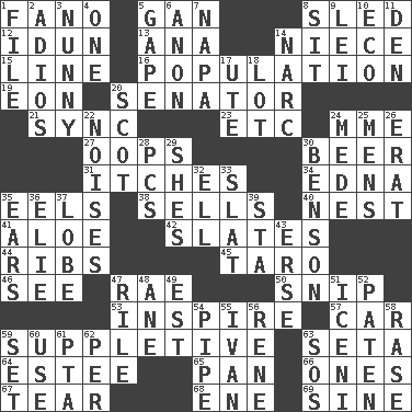 ACROSS 1. Papal veil 5. Separate the seeds from cotton 8. Downhill vehicle 12. Goddess of spring and wife of Bragi 13. Santa ___, CA 14. Sibling's daughter 15. Actor's bit 16. Census information 19. Period of immesurable duration 20. Elected representative 21. Synchronize (abbr.) 23. And so on (abbr.) 24. Madame (abbr.) 27. I made a mistake 30. Fermented drink made from hops 31. Skin irritations 34. Pulitzer Prize-winning author Ferber 35. Snakelike fish 38. Exchanges for money 40. Egg locale 41. _ vera 42. Chalkboards 44. Chest bones 45. Pacific island yam 46. Observe 47. Actress Charlotte 50. Sever or remove by pinching or nipping 53. Motivate 57. 4-wheeled motor vehicle 59. Supplying deficiencies 63. Stalk of a moss capsule 64. First name in cosmetics 65. Baking dish 66. Singles 67. Pull into pieces 68. Compass dir. 69. Trig term DOWN 1. Do some clerical work 2. Goodbye (Sp.) 3. Pet term 4. Single 5. Open wide 6. Soon (poet.) 7. California wine valley 8. Be seated 9. Luau accessory 10. Environmental prefix 11. Lair 14. Drug cop 17. Shoshoni 18. Car dealer's back yard 20. Highlander 22. Annoying sounds 24. Ancient Persian 25. Not women's 26. Part of Q.E.F. 28. Personal Computers (abbr.) 29. "______ My Girl" (Turtles hit) 30. Gillaume's butler role 32. Pipe bend 33. Narrow board 35. Hearing organs 36. Writer Wiesel 37. Ear part 39. R.R. building 43. Celtic language 47. Cause heat under the collar 48. A saturated hydrocarbon 49. Eastern Standard Time (abbr.) 51. Ancient Celtic tribe of eastern Britain 52. Eucharist need 54. Corncob 55. "Terrible" tsar 56. French philosopher Descartes 58. To erase 59. Put into a specified state 60. Purpose 61. Parent Teacher Assoc. 62. For each 63. Distress signal
