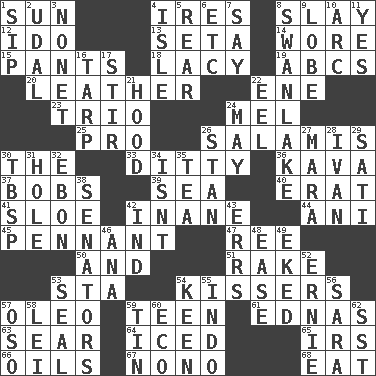 ACROSS 1. Player for Phoenix 4. Angers 8. Kill 12. Wedding promise 13. Bristle 14. Had on 15. Leg coverings 18. Made of lace 19. Lettered men learn these first 20. Cordwainer's material 22. Compass dir. 23. Musical group of three 24. Cartoonist voice _ Blanc 25. Adept person 26. Deli grouping 30. Definite Article 33. Simple song 36. Polynesian shrub of the pepper family 37. Moves up and down 39. Ocean 40. Part of Q.E.F. 41. _ gin 42. Empty; void 44. Black tropical American cuckoo 45. Pre-World Series prize 47. To riddle 50. Also 51. Libertine 53. R.R. building 54. Smoochers 57. Margarine 59. Adolescent 61. Ferber et al. 63. Shrivel 64. On the rocks 65. Big collection agency 66. Petroleums 67. Words to Nanette 68. Erode DOWN 1. Small drink 2. Allodial 3. Music written for nine 4. Capri or Wright 5. Bring up, as a child 6. And so on (abbr.) 7. Declare 8. Tchaikovsky ballet 9. Ear part 10. Curve 11. Affirmative reply 16. Canvas cover 17. Commotion 21. Parka part 22. Snakelike fish 24. Fifth month 26. Comedian Laurel of Laurel & Hardy 27. Hindu Mythology: god of death 28. _ the terrible 29. Suttee (variant) 30. Cook's measure (abbr.) 31. Opening into or through something 32. Inky black, to poets 34. Is not 35. Beverage made from leaves 38. Elected representatives 42. Indiana (abbr.) 43. Blunders 46. Santa ___, CA 48. Comfort 49. Supplemented with great effort 52. Bert's buddy 53. Lick closed 54. Peachy ____! 55. Southeast Asian peninsula 56. "Two Mules for Sister ____" 57. Bear (Spanish) 58. Flowery wreath 59. Metal container 60. Environmental prefix 62. Fast jet (abbr.)