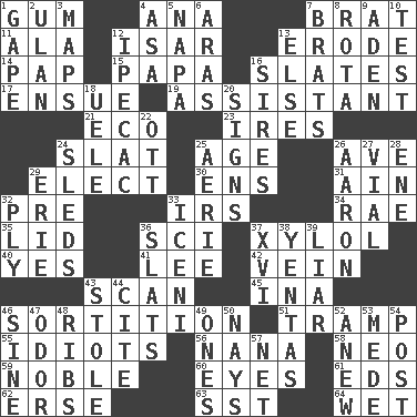 ACROSS 1. Chewing product 4. Santa ___, CA 7. Naughty child 11. According to 12. Austrian river, tributary to the Danube 13. Eat (away) 14. Infant food 15. Dad 16. Chalkboards 17. Take place subsequently 19. Helper 21. Environmental prefix 23. Angers 24. Narrow board 25. Mature 26. "___ Maria" 29. Opt 30. Followers of ems 31. The 18th letter of the Arabic alphabet 32. Before (prefix) 33. Big collection agency 34. Actress Charlotte 35. Flaplike covering 36. _-fi 37. Xylene (variant) 40. It is so 41. Area sheltered from the wind 42. Distinctive style or manner 43. Examine minutely or intensely 45. _ tizzy (2 wds.) 46. Decision 51. _____ steamer (cargo ship) 55. Foolish or stupid persons 56. Nanny 58. Modern: prefix 59. Impressive in appearance 60. Sight organs 61. Begley and Asner 62. Celtic language 63. Fast jet (abbr.) 64. Soggy DOWN 1. Stare wonderingly 2. ____ Bator, Mongolia 3. Atlas contents 4. White ___ sheet 5. California wine valley 6. Caspian sea tributary 7. Naughty children 8. Roll call or roster of names 9. An important port of Yemen 10. Trial 12. Medicinal drug used to evoke vomiting 13. Otherwise 16. Begets 18. Ubangi River tributary 20. Omens 22. Baseball player Mel 24. Bobsleighs 25. Nest on high 26. Composer Copland 27. Small bottle 28. Compass dir. 29. One of the Great Lakes 32. Apply oneself diligently 33. Ancient Celtic tribe of eastern Britain 36. Narrow boards 37. 16 38. Gossips 39. One who doesn't tell the truth 43. Took without asking 44. Quote 46. Trig term 47. Aroma 48. Teases 49. Washington bills 50. Negative votes 52. Afresh 53. Ancient Persian 54. Mail 57. Fish or hair follower