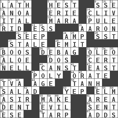 ACROSS 1. Thin strip of wood or metal 5. Command 9. Compass dir. 12. Small Philippine buffalo 13. 4th largest of the Great Lakes 14. 154 in Roman numerals 15. Slanted text style (abbr.) 16. Hindu Mythology: god of death 17. Whimper 18. To free from 19. Curvy letter 21. Composer Copland 22. Ooze 24. Electrical Unit 26. Fast jet (abbr.) 27. Having lost freshness 28. Give off 29. Scornful sounds 30. Debunk (Brit. slang) 32. Margarine 36. Medicinal plant 37. Two (Sp.) 38. Foregone conclusion 39. 1994 drama film starring Jodie Foster 40. 2nd pers. sing. pres. of can (arch.) 42. Compass direction 43. More than one (prefix) 44. Declaim 46. Federal power corp. 49. Personal question 50. Hyperbolic tangent 51. First course 53. Slangy assent 54. Shade tree 57. SW Saudi Arabia district 58. Create 61. Type of rug 62. Gouge 63. Tending to cause great harm 64. Posted 65. Compass dir. 66. Canvas cover 67. Does sums DOWN 1. Den 2. Opposed to 3. Inedible or poisonous agaric 4. Actor Linden 5. Folds over and sews together 6. Period 7. Title for a knight 8. Afternoon social gathering 9. Runs notes together 10. Grain storage towers 11. Happening 14. Tax preparer (abbr.) 19. Snakelike fish 20. Moved rapidly 21. Fitting 23. Artist's stand 24. Collect or gather 25. Russian fighter aircraft 27. Not divided or shared with others 28. Dark wood 29. Prohibit 31. Peak District village in England 32. Sea 33. Resembling or made to resemble leather 34. Celtic language 35. Baseball player Mel 40. Gear tooth 41. Haul 43. Groovy apt. 45. Hit sharply and swiftly 46. Sadhe (variant) 47. Flower holders 48. Place in a line 52. Tate display 53. Sharp bark 55. Grant temporary use of 56. Floor coverings 58. Was introduced to 59. Actress Gardner 60. Apertif with cassis 61. White ___ sheet