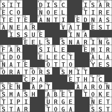 ACROSS 1. Be seated 4. Plate 8. Austrian river, tributary to the Danube 12. Environmental prefix 13. Christmas carol 14. Become fatigued 15. False hair 17. Against 18. Ferber et al. 19. Approach 21. Large container 23. Eastern Standard Time (abbr.) 24. Come out of 26. _ tizzy (2 wds.) 28. Snakelike fish 30. Catching in a trap 34. At a great distance 37. Filth; sediment 39. Arab leader 40. Wedding promise 41. Voters do this 43. According to 44. Nathan's nickname 46. Von Bismarck 47. Affirmative reply 48. Speakers 51. Stricken, poetically 54. Accounting whiz (abbr.) 55. Principle of right and wrong 58. Elected rep. 61. Fitting 63. Composer Copland 65. Box-office sellout 67. Collude with 71. Casino tip 72. Native american tent (variation) 73. Goad 74. Fish or hair follower 75. Play the lead 76. Ancient Roman robe 77. Fast jet (abbr.) DOWN 1. Stalk of a moss capsule 2. Ancient Celtic tribe of eastern Britain 3. Hauls 4. Heredity factor (abbr.) 5. Electrically charged atom 6. Arrange properly for use 7. 154 in Roman numerals 8. It would 9. Trig term 10. Ancient river in northeast Turkey 11. Remainder 16. Comfort 18. Inactive volcano in Sicily 20. Sorrow 22. The 18th letter of the Arabic alphabet 25. Otherwise 27. "We ___ not amused" (Victoria) 29. Grain storage towers 30. Religious groups 31. "If ____ say so..." 32. The longest river in the world 33. Pate de foie ____ 34. Fine (Spanish) 35. The sixth month of the Jewish calendar 36. Roll call or roster of names 38. Allow 42. Heavy book 45. And so on (abbr.) 49. Brightly colored fish 50. Strike 52. Call ___ day 53. Not this but _ 56. Metal shackles 57. Popular sodas 58. Fast planes 59. Give off 60. California wine valley 62. Pulled tight 64. Remaining after all deductions 66. Title for a knight 68. Sis' sibling 69. Oval reproductive body of a fowl 70. Beverage made from leaves