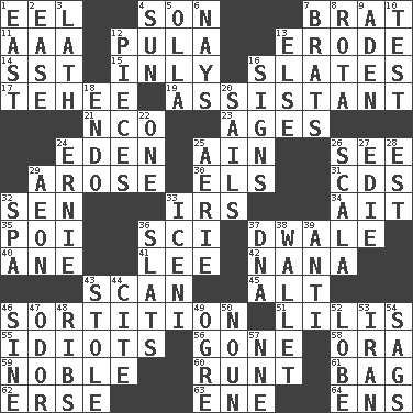 ACROSS 1. Snakelike fish 4. Manchild 7. Naughty child 11. Auto club (abbr.) 12. Monetary unit of Botswana 13. Wear away 14. Fast jet (abbr.) 15. In an inward manner 16. Chalkboards 17. Giggle 19. Aide 21. Non-commissioned officer (abbr.) 23. Grows older 24. Paradise 25. The 18th letter of the Arabic alphabet 26. Observe 29. Came up 30. Raised railways 31. Music discs 32. Elected rep. 33. Big collection agency 34. Small island 35. Luau course 36. _-fi 37. A sleeping potion; an opiate (poet.) 40. One (Scot) 41. Area sheltered from the wind 42. Nanny 43. Examine hastily 45. Keyboard modifier key 46. Drawing lots 51. Ms. Damita and namesakes 55. Foolish or stupid persons 56. Went 58. Mouth or opening 59. Having high moral qualities 60. The smallest animal of a litter 61. Container for groceries 62. Celtic language 63. Compass dir. 64. Followers of ems DOWN 1. 90 degrees 2. Relaxation 3. Thin strip of wood or metal 4. Player for Phoenix 5. Water jar 6. Negative votes 7. Naughty children 8. Roll call or roster of names 9. An important port of Yemen 10. Trial 12. Parts 13. Otherwise 16. Omens 18. Inside; within (prefix) 20. Moves on water 22. Single 24. Bert's buddy 25. Nest on high 26. Any of the three canals of the cochlea 27. Singer Brickell 28. Eastern Standard Time (abbr.) 29. A really long time 32. Health resort 33. Ancient Celtic tribe of eastern Britain 36. Narrow boards 37. Heredity factor (abbr.) 38. Place for singles 39. Against 43. Fur scarf 44. Quote 46. Trig term 47. Aroma 48. Chest bones 49. Legendary monster 50. Part of speech 52. Ear part 53. SW Asia republic 54. Settles 57. Compass dir.