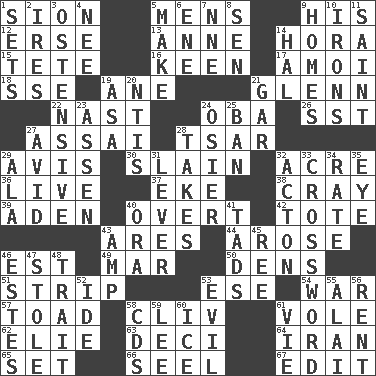 ACROSS 1. The Jewish people; Israel 5. Not women's 9. Part of HMS, perhaps 12. Celtic language 13. Singer Murray 14. Israeli folk dance 15. Wig 16. Peachy ____! 17. Mine, in Marseilles 18. Compass dir. 19. A saturated hydrocarbon 21. American astronaut and politician John 22. Political cartoonist Thomas 24. Chief or king in Benin or Nigeria 26. Fast jet (abbr.) 27. Slender Brazilian palm 28. Russian ruler of old 29. Advice 30. Killed 32. Measure of real estate 36. Moving, as bait 37. Supplement with great effort 38. Supercomputer manufacturer 39. Arabian gulf 40. Unconcealed 42. Lug 43. Ancient Greek god of war 44. Came up 46. Eastern Standard Time (abbr.) 49. Third mo. 50. Hiding places for outlaws 51. Remove all contents or possession from 53. Compass dir. 54. Armed conflict 57. Frog relative 58. 154 in Roman numerals 61. Grand slam 62. Writer Wiesel 63. Tenth: prefix 64. SW Asia republic 65. Arrange properly for use 66. Sew up the eyelids of hawks and falcons 67. Prepare for publication DOWN 1. Arranges properly for use 2. Angers 3. Clearly or manifestly demonstrative 4. Born 5. Create 6. Compass dir. 7. Compass dir. 8. Elected rep. 9. Residences 10. Removes the wrinkles 11. Virtuous person 14. Actor Linden 19. White ___ sheet 20. Nuclear Threat Initiatives 21. Slender fish 23. NE Netherlands city 24. Flexible twig of a willow tree 25. Forbid 27. Enthusiastic 28. Proceeds 29. Insect wing 31. Prying instrument 32. 13-14th century defensive garment 33. What you're doing now 34. Pace 35. Sight organ 40. Mouth or opening 41. Small boys 43. Electrical Unit 45. Portuguese money of account (variant) 46. _____ Park, CO 47. Fur scarf 48. Distinguishing feature 52. Binary compound 53. Tending to cause great harm 55. Jai _ 56. Monthly bill 58. Music discs 59. Area sheltered from the wind 60. Frozen water 61. Compete