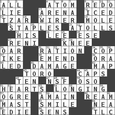 ACROSS 1. Everything 4. Smallest unit of an element 8. Do over again 12. Falsehood 13. Sports stadium 14. On the rocks 15. Russian ruler 17. One who wires 18. Undercover agent 19. Paper fasteners 21. Ringlike coral islands and reefs 23. Part of HMS, perhaps 24. Area sheltered from the wind 26. Compass dir. 27. Painter Guido (1575-1642) 28. Leg joint 30. Boat paddle 31. Food allowance for one day 34. Police officer (slang) 37. Mamie's husband 38. Make improvements or corrections to 39. Mouth or opening 40. Directed 41. Break 42. Atlas unit 43. "Corrida" creature 44. Smile enhancers 46. Nine, plus one 47. Science/research agcy. 50. Bear (Spanish) 51. Centers 54. Yearning 57. Legendary monster 58. At full speed 60. 480, 500 or 516 sheets of paper 62. Vertical spar for supporting sails 63. Grin 64. Teachers' org. 65. Singer Brickell 66. Elected reps. 67. Affectionate concern, for short DOWN 1. Keyboard modifier key 2. Belonging to Elizabeth 3. Resembling or made to resemble leather 4. Satellite of Uranus 5. Laconic 6. Single 7. Hindu Mythology: god of death 8. Full of chinks, cracks, or crevices 9. Learning spot: Fr. 10. Small valley 11. Lyric poems 13. Leather borer 16. Water falling in drops from the sky 20. Air pressure measure (abbr.) 22. Adolescent 25. Supplementing with great effort 27. Libertine 29. Thickened enlargement 30. Petroleum 31. Bring up, as a child 32. ID or VA city 33. Beverage made from leaves 34. Piece 35. Mouths or openings 36. Infant food 41. Do not 43. Cylindrical with tapered ends 44. Gear tooth 45. SW Saudi Arabia district 46. Tarsus (plural) 48. Killed 49. Fencing necessities 51. Dwelling 52. Mild oath 53. Backtalk 55. Compass dir. 56. Highlander 59. Madame (abbr.) 61. Apple computer (short form)
