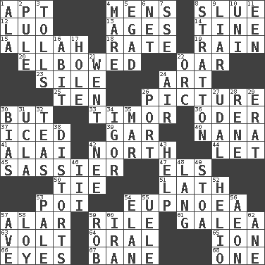 ACROSS 1. Fitting 4. Not women's 8. Turn sharply 12. Nilotic language 13. Ripens 14. Prong on a fork 15. Assad's deity 18. Assign a rank or rating to 19. Water falling in drops from the sky 20. Shoved, as through a crowd 22. Boat paddle 23. Drop; flow; fall 24. Tate display 25. Nine, plus one 26. Photo 30. On the contrary 33. Southeast Indonesia island 36. River in Europe 37. On the rocks 39. Slender fish 40. Grandmother 41. Jai ____ 42. 0 degrees 44. Allow 45. More disrespectful 47. Raised railways 50. Standoff 51. Thin strip of wood or metal 53. Luau course 54. Normal relaxed breathing 57. Having or resembling wings 59. Cause heat under the collar 61. An organ shaped like a helmet 63. Electrical Unit 64. Relating to the mouth 65. Electrically charged atom 66. Snake ____ (dice throw) 67. Object of repulsion 68. Single DOWN 1. Chicken ___ king 2. Whimper 3. For Whom the Bell _____ 4. Female horse 5. Mild oath 6. Fish or hair follower 7. Compass dir. 8. Ski resort town in Vermont 9. One who doesn't tell the truth 10. Single; one (prefix) 11. Car or cant ending 16. "This won't hurt ____!" 17. Opening into or through something 21. Gone 22. The grampus (Milton) 24. Wind 26. Left side of a ship or aircraft 27. Allodial 28. French philosopher Descartes 29. Part of Q.E.F. 30. Prejudice 31. Southern CA. univ. 32. Beverages made from leaves 34. Russian composer Stravinsky 35. Third mo. 38. What propaganda does 42. Born 43. Aid 46. One more than two 48. Long (Scottish) 49. Portico 52. Sun: prefix 53. Diluted with white 54. Liveliness 55. Ubangi River tributary 56. A really long time 57. "___ Maria" 58. Myrna of the movies 59. Director Reiner 60. Retirement account (abbr.) 62. One (Scot)