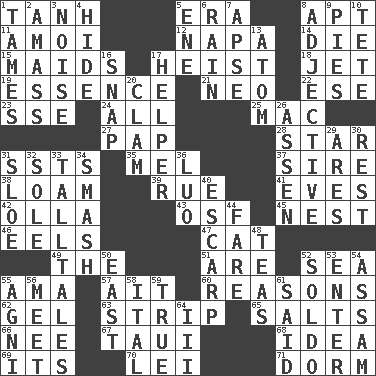 ACROSS 1. Hyperbolic tangent 5. Epoch 8. Fitting 11. Mine, in Marseilles 12. California wine valley 14. Pass on 15. Women servants 17. Robbery 18. Passenger plane 19. Substance 21. Modern: prefix 22. Compass dir. 23. Compass dir. 24. 100% 25. Big _ 27. Infant food 28. Play the lead 31. Fast planes 35. Cartoonist voice _ Blanc 37. Male parent of an animal 38. Rich soil 39. Regret 41. Nights before holidays 42. Rounded earthenware pot or jar 43. Order of Saint Francis (abbr.) 45. A home for chicks 46. Snakelike fish 47. Domesticated feline 49. Definite Article 51. "We ___ not amused" (Victoria) 52. Ocean 55. Housemaid (var.) 57. Small island 60. Thinks logically 62. Set 63. Remove all contents or possession from 65. Table seasonings 66. Born 67. "Change" in Tahitian 68. It may be bright or harebrained 69. It is 70. Flowery wreath 71. Dormintory (informal) DOWN 1. Corrects by punishment or discipline 2. Collect or gather 3. Annoying sound 4. Flintstone garb 5. Compass dir. 6. Water falling in drops from the sky 7. Domed church section 8. Descriptive word 9. Sliced desserts 10. Wig 13. Tiny particle 16. Fastener 17. Assistant 20. Dollar (slang) 26. NE Netherlands city 29. Ancient Greek god of war 30. Remainder 31. A type of plum 32. Not divided or shared with others 33. Baron Munchausen's specialties 34. Box-office sellout 36. Nilotic language 40. Fortification 44. Conductor's collection 48. Beverages made from leaves 50. Compass direction 52. Twentieth part of a lira 53. Keyboard key 54. Indian state 55. Hindu god of fire 56. Rendezvous 58. Slanted text style (abbr.) 59. Loyal 61. Expressed in words 64. One more than two