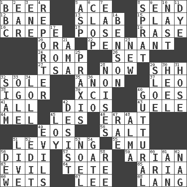 ACROSS 1. Fermented drink made from hops 5. Adept person 8. Transmit 12. Object of repulsion 13. Thick slice 15. Frolic 16. Streamer paper 18. Airs 19. To erase 20. Mouth or opening 22. Pre-World Series prize 24. Play 26. Put into a specified state 27. Russian ruler of old 28. Immediately 29. Quiet! 32. Flatfish 35. Soon (poet.) 37. Lion 38. Composer Stravinsky 39. One more than ninety 40. Moves 41. Everything 42. "Vaya con ____" 43. Ubangi River tributary 44. Cartoonist voice _ Blanc 45. French article 46. Part of Q.E.F. 49. Greek goddess of the dawn 50. Table seasoning 51. Imposing or collecting, as a tax 55. Australian flightless bird 56. "You Light Up My Life" star Conn 57. Fly high 59. Believer in; advocate of (suffix) 63. Morally bad or wrong 64. False hair 65. Roberta Peters solo 66. Moistens 67. Area sheltered from the wind 68. Austrian-born American filmmaker Fritz DOWN 1. English channel? 2. Ewer handle 3. Compass dir. 4. Newsperson 5. Viper 6. Hoof sound 7. Relaxation 8. Small fatty European fish 9. Flair 10. Political cartoonist Thomas 11. Color 14. Gillaume's butler role 17. Greek god of love 21. Housemaid (var.) 23. ___ Haven, CT 25. Habitual or established practice 28. Annoying sounds 29. A type of plum 30. Person who is morally reprehensible 31. Flexible conduit 32. Thailand, formerly 33. Stare at amorously 34. Hang loosely or laxly 36. Non-commissioned officer (abbr.) 40. From the throat 42. Stop 45. Myrna of the movies 47. Actress Charlotte 48. _ mater 49. Vices 51. Moving, as bait 52. Prepare for publication 53. Christmas carol 54. Yard entry 56. Morning condensation 58. To separate or throw off 60. Retirement account (abbr.) 61. The 18th letter of the Arabic alphabet 62. Tired old horse