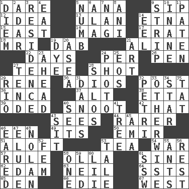 ACROSS 1. Have the gumption 5. Nanny 9. Small drink 12. The content of cognition 13. ____ Bator, Mongolia 14. Inactive volcano in Sicily 15. 90 degrees 16. Wise men 17. Part of Q.E.F. 18. Medical imaging device (abbr.) 19. Small moist lump or mass 21. Place in a line 22. 24-hour periods 24. For each 26. Writing instrument 27. Giggle 28. Opportunity 29. French philosopher Descartes 30. Goodbye (Sp.) 32. Mail 36. South American Indian 37. Keyboard modifier key 38. Singer James 39. Wrote a lyric poem 40. Snout, nose 42. Not this but _ 43. Perceives with the eye 44. Less widely known 46. Car or cant ending 49. It is 50. Independent ruler or chieftain 51. High up in or into the air 53. Beverage made from leaves 54. Armed conflict 57. Governing power 58. Rounded earthenware pot or jar 61. Trig term 62. Dutch treat 63. Famous astronaut Armstrong 64. Fast planes 65. Lair 66. Singer Brickell 67. 270 degrees DOWN 1. South Vietnam president (1954) 2. The sixth month of the Jewish calendar 3. Home 4. Erode 5. Unfeeling 6. In the manner of 7. Tired old horse 8. Cuckoo 9. Remove all contents or possession from 10. Lacking in sense or substance 11. Eucharist need 14. Snakelike fish 19. Color 20. At sea 21. Tate display 23. Having the leading position 24. Picture 25. Greek goddess of the dawn 27. Be inclined (to) 28. Grain storage towers 29. River (Sp.) 31. Natives or inhabitants of Denmark 32. _ dish (used to culture cells) 33. Else 34. Play the lead 35. Make lace 40. Put into a specified state 41. Relationship diagram 43. Be seated 45. Housemaid (var.) 46. Having ears or earlike features 47. Dodge 48. Pitcher Ryan 52. Opposite of masc. 53. Falsehood 55. Pismires 56. Remainder 58. Single 59. Directed 60. Cards in a Roman deck? 61. Compass dir.