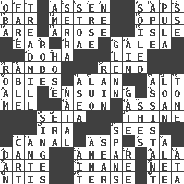 ACROSS 1. Often (poetically) 4. NE Netherlands city 9. Plant excrements 13. Soap unit 14. Distance measurement (Brit.) 15. Musical composition 16. "We ___ not amused" (Victoria) 17. Came up 18. Small island 19. Ewer handle 21. Actress Charlotte 22. An organ shaped like a helmet 24. Capital of the state of Qatar 26. Untruth 27. Role for Stallone 29. Tear apart 30. Off-Broadway awards 31. Actor Alda or Thicke 33. The first octave above the treble staff 36. Everything 37. Taking place subsequently 40. "Barney Miller" actor Jack 41. Cartoonist voice _ Blanc 42. Period of immesurable duration 43. Indian state 45. Bristle 47. One or ones belonging to thee 48. Lyricist Gershwin 49. Perceives with the eye 50. Lessep's creation 52. Cleo's killer 54. R.R. building 56. Mild oath, euphamism for damn 57. Approach 59. Wing 61. Johnson of "Laugh-In" 62. Silly 63. Fish or hair follower 64. Nuclear Threat Initiatives 65. Laconic 66. Afternoon social gathering DOWN 1. Chief or king in Benin or Nigeria 2. Conductor's collection 3. Excercise machine 4. Wet nurse (var.) 5. Spanish missionary in California 6. Portico 7. Celtic language 8. Born 9. Dirtied 10. Domed church section 11. Monetary unit of Botswana 12. Compass dir. 20. Loose flowing garment 22. American astronaut and politician John 23. The 18th letter of the Arabic alphabet 25. Stockings 27. Wander 28. Competent 29. Water falling in drops from the sky 31. At sea 32. Nilotic language 33. Aide 34. Grant temporary use of 35. Heavy book 38. Brizilian seaport 39. Yard entry 44. "______ My Girl" (Turtles hit) 45. Scorches 46. Epoch 49. Connects, as a bridge 50. Haul 51. Against 52. Singer Murray 53. Burn superficially 55. Toward shelter 56. Daniel's nick name 57. Small island 58. Portuguese money of account (variant) 60. _ moment's notice (2 wds.)