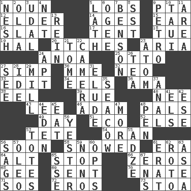 ACROSS 1. Part of speech 5. Tennis shots 9. Parent Teacher Assoc. 12. A person who is older than you are 14. Eons 15. Hearing organ 16. Chalkboard 17. Portable shelter 18. Third day of the wk. 19. Actor Linden 20. Skin irritations 23. Operatic vocal solo 24. Small Philippine buffalo 25. Von Bismarck 27. Simple or foolish person 30. Madame (abbr.) 32. Modern: prefix 33. Prepare for publication 34. Snakelike fish 36. Nanny (var.) 38. Snakelike fish 39. Regret 40. Born 43. Area sheltered from the wind 46. First man 48. Friends 49. 24 hours 51. Environmental prefix 52. Otherwise 53. False hair 54. NW Algerian seaport 56. Within a short period 58. Frozen precipiation fell 61. Epoch 64. Keyboard modifier key 65. Halt 66. Nothings 68. Unit of force equal to gravity 69. Transmitted 70. Related on the mother's side 71. Mayday 72. Greek god of love 73. Portico DOWN 1. Delicate 2. Spanish pot 3. Allodial 4. Fish or hair follower 5. Thin strip of wood or metal 6. Double curve, resembling the letter S 7. Gillaume's butler role 8. Fast jet (abbr.) 9. Stone: prefix 10. "Change" in Tahitian 11. Type of rug 13. It's straight from the horse's mouth 21. Heavy book 22. Device for capturing images 23. Tiny particle 24. Fitting 26. Beverage made from leaves 27. Perceive with the eye 28. Binary compound 29. Place where flour is made 31. Dodge 35. Manatee 37. Of or related to the anus 41. Raised railways 42. Compass dir. 44. Locale of original sin 45. Consume 47. Greater amount 48. Animal enclosure 50. Last 53. Hauls 55. Edge tool used to cut and shape wood 56. Sinks 57. Margarine 59. Words to Nanette 60. Chooses 61. Part of Q.E.F. 62. Printing process, for short 63. At sea 65. Compass dir. 67. Followers of ems