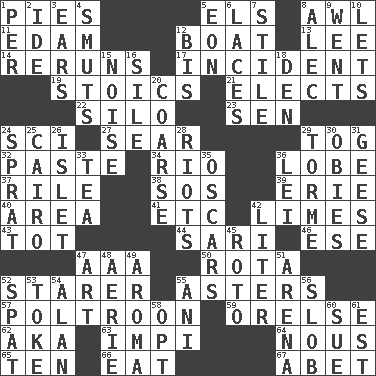 ACROSS 1. Sliced desserts 5. Raised railways 8. Leather borer 11. Dutch treat 12. Water vessel 13. Area sheltered from the wind 14. Summer TV shows 17. Event 19. Unemotional ones 21. Chooses 22. Grain storage tower 23. Elected rep. 24. _-fi 27. Scorch 29. Coat; cloak 32. Thick mixture 34. _ de Janeiro 36. Ear part 37. Cause heat under the collar 38. Mayday 39. One of the Great Lakes 40. Type of rug 41. And so on (abbr.) 42. Citrus fruits 43. Small child 44. Indian skirt 46. Compass dir. 47. Auto club (abbr.) 50. Roll call or roster of names 52. A viewer who gazes fixedly 55. Michaelmas daisies 57. Coward 59. Threatening words 62. Alias (abbr.) 63. Body of Kaffir warriors 64. Good sense 65. Nine, plus one 66. Ingest 67. Collude with DOWN 1. For each 2. Binary compound 3. Hearing organs 4. Obscenities 5. Period of immesurable duration 6. Shoestrings 7. Vertical member of a panel or frame 8. Actor Baldwin 9. Gone 10. Allows 12. Altar cloth linen 15. Annoying sound 16. Drop; flow; fall 18. Lair 20. Unrefined 24. Small fatty European fish 25. Capital of Egypt 26. Small island 28. Debaucheries 29. Singer Mel 30. Off-Broadway awards 31. Honkers 33. Beverage made from leaves 35. Motion picture awards 36. Luau accessory 42. 61 cubic inches 45. Printing process, for short 47. Tate display 48. Nest on high 49. Scent 51. Sports stadium 52. Petty quarrel 53. Puff or smoke 54. ____ Jay Lerner 55. Black tropical American cuckoo 56. Oscar Madison type 58. Choose 60. Take to court 61. Eastern Standard Time (abbr.)