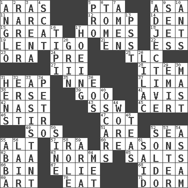 ACROSS 1. Caspian sea tributary 5. Parent Teacher Assoc. 8. White ___ sheet 11. Drug cop 12. Play 14. Lair 15. Relatively large 17. Residences 18. Passenger plane 19. Small, flat, pigmented spot on the skin 21. Followers of ems 22. Double-curved letter 23. Mouth or opening 24. Before (prefix) 25. Affectionate concern, for short 27. One more than two 28. A distinct part 31. Pile 35. Compass dir. 37. Pale green bean 38. Celtic language 39. Thick or sticky substance 41. Opinion 42. Political cartoonist Thomas 43. Compass dir. 45. Foregone conclusion 46. Agitate 47. Small bed 49. Mayday 51. "We ___ not amused" (Victoria) 52. Ocean 55. Keyboard modifier key 57. Lyricist Gershwin 60. Thinks logically 62. Sound made by sheep 63. Typical standards 65. Table seasonings 66. Storage container 67. Writer Wiesel 68. The content of cognition 69. Nonscientific branch of learning 70. Ingest 71. Dormintory (informal) DOWN 1. White American of non-Hispanic descent 2. More uncommon 3. Sports stadium 4. Jazz singing style 5. Adept person 6. Heavy book 7. So be it 8. Descriptive word 9. Observes 10. Pismires 13. Inconspicuous attention getter 16. Native american tent (variation) 17. Weeding 20. Broad smile 26. Pale purple color 29. Independent ruler or chieftain 30. Vertical spar for supporting sails 31. Coop moms 32. Part of Q.E.F. 33. Helper 34. Stone: prefix 36. Greek goddess of the dawn 40. Motion picture awards 44. Had on 48. Afternoon social gatherings 50. Trig term 52. Twentieth part of a lira 53. Keyboard key 54. Indian state 55. Swedish rock group 56. Den 58. Hero or heavy, e.g. 59. Operatic vocal solo 61. Alleged 64. Was introduced to
