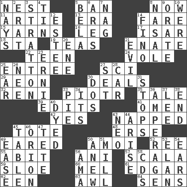 ACROSS 1. Egg locale 5. Bar 8. At this time 11. Nick name for Arthur 13. Epoch 14. Conductor's collection 15. Entertaining tales 16. Part of a journey 17. Austrian river, tributary to the Danube 18. R.R. building 19. Beverages made from leaves 21. Maternal 22. Adolescent 24. Short-tailed, large-bodied rat 25. Main course 27. _-fi 29. A really long time 30. Allots cards 32. Painter Guido (1575-1642) 33. Peter (Polish) 35. Lie 39. Proofreads 41. Presage 42. It is so 43. Slept 45. Lug 48. Celtic language 49. Having ears or earlike features 50. Mine, in Marseilles 52. Portuguese money of account (variant) 55. "This won't hurt ____!" 56. Black tropical American cuckoo 57. Any of the three canals of the cochlea 59. _ gin 60. Cartoonist voice _ Blanc 61. _ Allan Poe 62. Car or cant ending 63. Leather borer 64. Elected reps. DOWN 1. Negative votes 2. Part of Q.E.F. 3. Ski resort town in Vermont 4. Shallow baking pan 5. Actor Lugosi 6. Ancient Greek god of war 7. Tired old horse 8. Relating to the nose 9. Speak pompously 10. We are 12. First name in cosmetics 14. A pale, very dry sherry 20. Compass dir. 21. Morally bad or wrong 23. Bert's buddy 25. Hearing organ 26. Born 27. Arrange properly for use 28. Auto 30. Two (Sp.) 31. Discontinues 33. Sliced dessert 34. It is 36. Electrical Measurement 37. Area sheltered from the wind 38. Conclusion 40. Colored 43. Modern: prefix 44. Originate 45. Eating place 46. Constellation of myth 47. Wig 49. Comfort 50. Afresh 51. Place where flour is made 53. Enthusiasm 54. Hearing organs 56. Nursemaid (var.) 58. Music discs