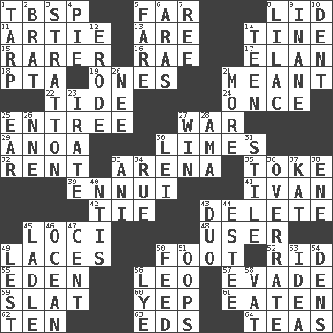 ACROSS 1. Cook's measure (abbr.) 5. At a great distance 8. Flaplike covering 11. Nick name for Arthur 13. "We ___ not amused" (Victoria) 14. Prong on a fork 15. More valued for its uncommonness 16. Actress Charlotte 17. Style 18. Parent Teacher Association (abbr.) 19. Singles 21. Intended 22. Periodic rise and fall of the sea level 24. Single time 25. Main course 27. Armed conflict 29. Small Philippine buffalo 30. Citrus fruits 32. Monthly bill 33. Sports stadium 35. Casino tip 39. World-weariness 41. _ the terrible 42. Standoff 43. Keyboard key 45. Venues 48. One who uses or employs something 49. Shoestrings 50. Lowest support of a structure 52. To free from 55. Locale of original sin 56. Lion 57. Elude 59. Narrow board 60. Slangy assent 61. Consumed 62. "___ Little Indians" 63. Begley and Asner 64. Afternoon social gatherings DOWN 1. Canvas cover 2. Naughty child 3. Ski resort town in Vermont 4. Sliced dessert 5. Conductor's collection 6. Ancient river in northeast Turkey 7. To sift 8. Pale purple color 9. Lacking in sense or substance 10. Incision 12. Wear away 14. Adolescent 20. Born 21. Greater amount 23. Feeling or showing extreme anger 25. Ewer handle 26. Compass dir. 27. Victory 28. Wet nurse (var.) 30. Luau accessory 31. Vertical member of a panel or frame 33. Black tropical American cuckoo 34. Regret 36. Make much ado about nothing 37. Krazy ___ of comics 38. Compass dir. 40. Nuclear Threat Initiatives 43. Superhero pair 44. First name in cosmetics 45. Dipping utensil 46. Sea 47. Penny 49. For fear that 50. Nourish 51. I made a mistake 53. The content of cognition 54. Habitations of wild animals 56. Sodium hydroxide 58. Large container
