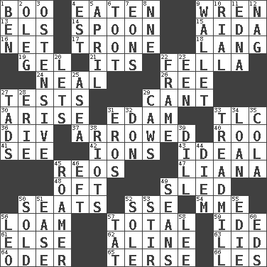 ACROSS 1. Oct. 31 cry 4. Eroded 9. Songbird 13. Raised railways 14. Soup utensil 15. Opera by Verdi 16. Fish or hair follower 17. Heavy duty weighing machine 18. Long (Scottish) 19. Set 21. It is 22. Man or boy (slang) 24. Anneal 26. To riddle 27. Trials 29. Patter 30. Get up 31. Dutch treat 33. Affectionate concern, for short 36. HTML Container Element 37. Moved like an arrow 40. Friend of Pooh 41. Observe 42. Charged particles 43. Standard of perfection 45. Vintage cars 47. Climbing, woody, usually tropical vines 48. Often (poetically) 49. Downhill vehicle 50. Theater features 52. Compass dir. 54. Madame (abbr.) 56. Rich soil 57. "_____ Recall" 59. Binary compound 61. Otherwise 62. Place in a line 63. Flaplike covering 64. River in Europe 65. Laconic 66. French article DOWN 1. Benjamin's nick name 2. Cassini of fashion 3. Clearly or manifestly demonstrative 4. Eastern Standard Time (abbr.) 5. Showery time 6. A blast of a horn 7. Immeasurably long periods of time 8. Compass dir. 9. Place for singles 10. Monetary unit of Yemen 11. Pulitzer Prize-winning author Ferber 12. Tired old horse 20. Allows 22. Movie unit 23. Car or cant ending 25. Toward the sea 27. Small boys 28. 4th largest of the Great Lakes 29. Crow sounds 31. Greek god of love 32. Spanish title 33. Excercise machine 34. Grant temporary use of 35. Root beer relative 38. Disturbances 39. Deli pickle 44. South Vietnam president (1954) 45. Wanderer 46. Newt 49. Actors Connery and Penn 50. Exchanged or delivered for money 51. Comfort 52. Not divided or shared with others 53. Tumult 55. Singer Brickell 56. Lion 57. Make lace 58. Area sheltered from the wind 60. Begley and Asner