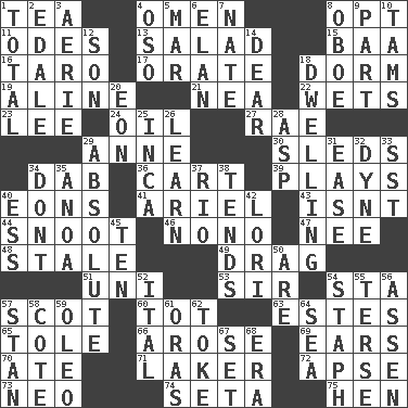 ACROSS 1. Beverage made from leaves 4. Sign of something about to happen 8. Choose 11. Lyric poems 13. First course 15. Sound made by sheep 16. Edible starchy tuberous root 17. Speak pompously 18. Dormintory (informal) 19. Place in a line 21. Teachers' org. 22. Soaks 23. Area sheltered from the wind 24. Petroleum 27. Actress Charlotte 29. Singer Murray 30. Bobsleighs 34. Pat or tap gently 36. Draw slowly or heavily 39. Frolics 40. Immeasurably long periods of time 41. Satellite of Uranus 43. Is not 44. Snout, nose 46. Words to Nanette 47. Born 48. Showing deterioration from age 49. To be drawn or hauled along 51. University (slang) 53. Title for a knight 54. R.R. building 57. Highlander 60. Small child 63. _____ Park, CO 65. Lacquered or enameled metalware 66. Came up 69. Hearing organs 70. Had dinner 71. Member of a famous L.A. basketball team 72. Domed church section 73. Modern: prefix 74. Bristle 75. Layer DOWN 1. "_____ Recall" 2. Peak District village in England 3. Nest on high 4. Bear (Spanish) 5. Impair 6. Flair 7. Nathan's nickname 8. Mitch Miller's instrument 9. Component 10. Scottish caps 12. Boy, to dad 14. Letter starter 18. Home 20. Age 25. South American Indian 26. Acquire or gain knowledge or skills 28. Cleo's killer 29. Utter; complete 31. Comfort 32. Unit of force 33. Fast jet (abbr.) 34. Do not 35. Small Philippine buffalo 37. River (Sp.) 38. Watches over 40. Double-curved letter 42. Australian parrot (variant) 45. Nine, plus one 50. "We ___ not amused" (Victoria) 52. Slanted text style (abbr.) 54. Staphylococcus 55. Laconic 56. NE Netherlands city 57. Comedian Laurel of Laurel & Hardy 58. ____ d'Azur (French Riviera) 59. Butter sub 61. Mouths or openings 62. Casino tip 64. Ocean 67. Arrange properly for use 68. Epoch