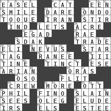 ACROSS 1. Artist's stand 6. Domesticated feline 9. Car or cant ending 12. Grin 13. Have the gumption 14. Southwest Nigerian state 15. Woman's close-fitting hat 16. SW Asia republic 17. Disorderly outburst 18. Indiana (abbr.) 19. Allows 20. 1/640 square mile 21. Mild oath 23. Actress Charlotte 24. Neighbor of Neb. 25. Barter 28. Connecticut Ivy Leaguer 30. Congenital growth or mark on the skin 34. Play the lead 35. Label 36. The wife of a rajah (variant) 38. One more than two 39. Prong on a fork 41. Colored lightly or faintly 43. Compass dir. 44. Believer in; advocate of (suffix) 46. Mouths or openings 48. Bear (Spanish) 49. Secret move to avoid paying debts 50. Ship's personnel 51. Greater amount 53. Baseball player Mel 56. Silvers or Donahue 57. A pale, very dry sherry 58. Killed 60. Perceives with the eye 61. Cassini of fashion 62. Evade 63. Big collection agency 64. Raised railways 65. First name in cosmetics DOWN 1. Eastern Standard Time (abbr.) 2. Mine, in Marseilles 3. The Jewish people; Israel 4. Evaded 5. Area sheltered from the wind 6. Heavy open wagon 7. Ancient river in northeast Turkey 8. Nine, plus one 9. Pleas 10. Singer Brickell 11. And not 13. Passed on 14. Motion picture awards 19. Member of a famous L.A. basketball team 20. Tate display 22. Separate the seeds from cotton 24. Seigniories (variant) 26. Raised platform 27. One of the Great Lakes 28. Singer James 29. Den 31. Large container 32. Single; one (prefix) 33. Elected rep. 37. Learning spot: Fr. 40. Artist's stands 42. Three (prefix) 45. Immediately 47. Ringlike coral islands and reefs 49. Toadlike animal 50. "Mermaids" star 51. Place where flour is made 52. Washington bills 54. Drawn tight 55. Periodic rise and fall of the sea level 56. 23rd letter of the Greek alphabet 57. Enemy 58. Observe 59. Born